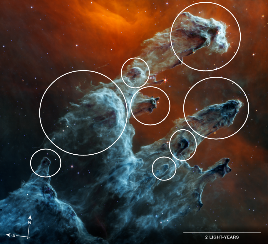 恐怖的韦伯中红外镜头下的创生之柱!橙红色的背景下幽蓝的前景星云加上阴森的黑色星云头部,整个画面显得相当诡异,活像一堆妖魔鬼怪……我圈出来了,大家看看像不像……