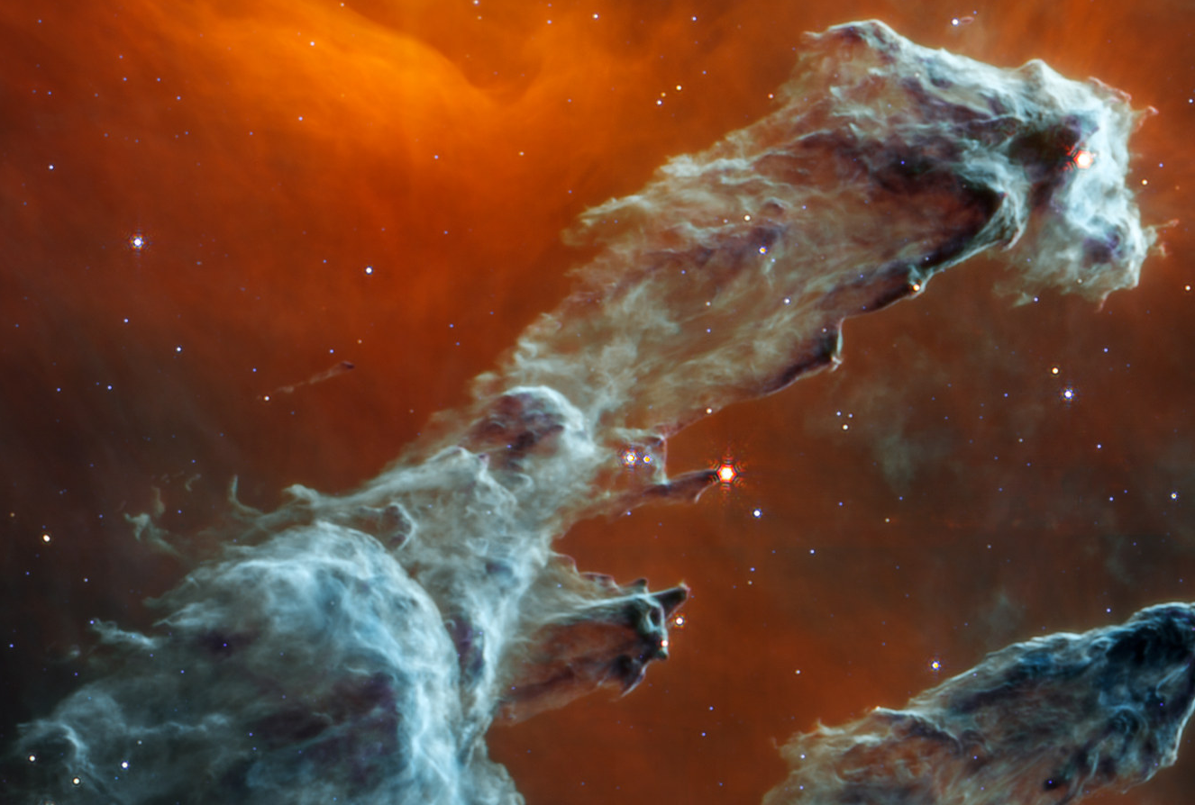 整个画风与之前公布的近红外相机6波段拍摄的创生之柱真实天渊之别。除了色彩以外,与前作相比还有很明显的一个差异就是原本熠熠生辉的背景恒星几乎消失殆尽,只剩下寥寥数十颗……