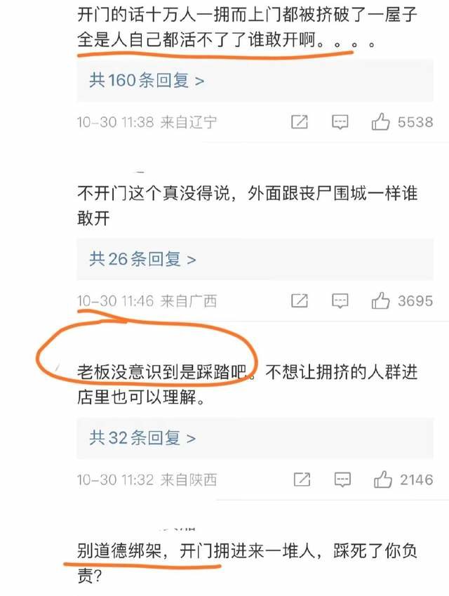 可更多网友留言却说,这个时候不要道德绑架了,夜店老板也许不知道外面正在经历踩踏的人间炼狱。又或许,就算那一刻他“开门迎客”,千人冲进店里,恐怕房子都要挤塌了,后果有可能不会更好。