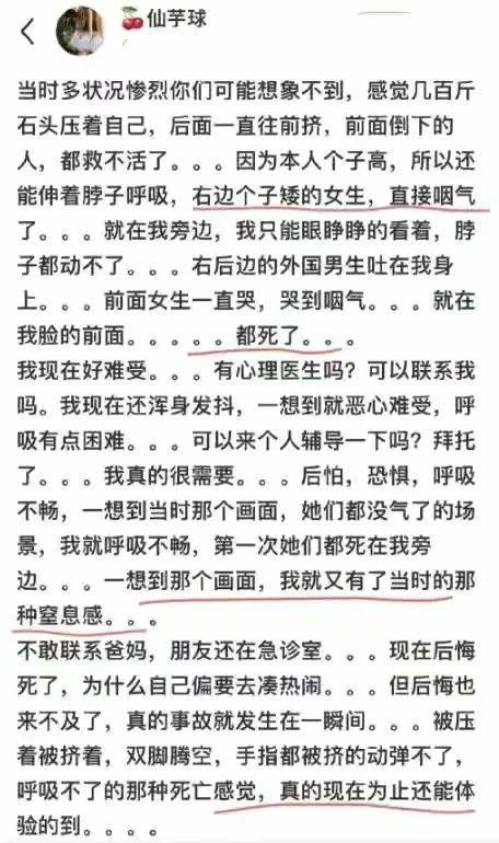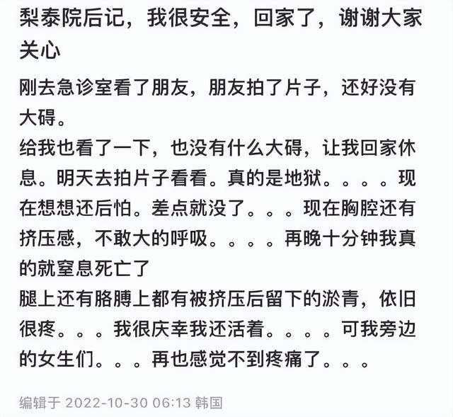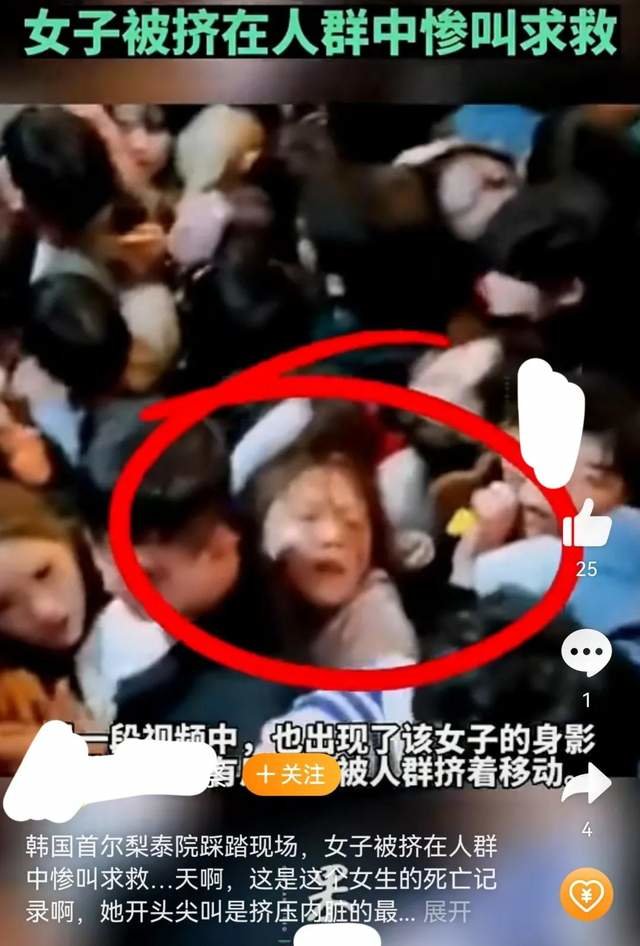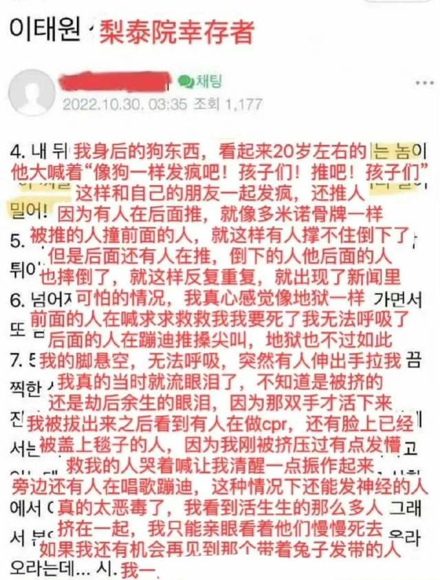 有在现场死里逃生的韩国网友后来通过自己的社交平台记述着,现场有人在后面大喊:挤吧,推吧,一起灭亡吧!随后后面的人仿佛听到某种启示一样,纷纷往前用力挤。