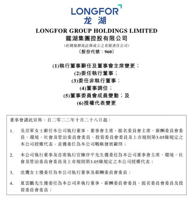 10月28日,龙湖集团发布公告,原董事长吴亚军因年龄和身体原因卸任董事长,转任公司战略发展顾问;副董事长邵明晓从执行董事调任为非执行董事。