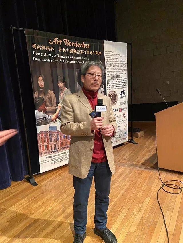 宾西法尼亚大学学生会副主席 Chris Yang代表学生发言。他说从小就听说冷军先生的鼎鼎大名,今天的活动,给每个爱艺术的学生提供了一个极佳的距离,向大师学习,机会难得。冷军先生能有如此公益心,公开为艺术爱好者们无私地传播他的绘画技巧,拥有极大的胸怀,也为中美艺术搭建桥梁令人敬佩。