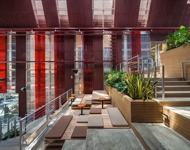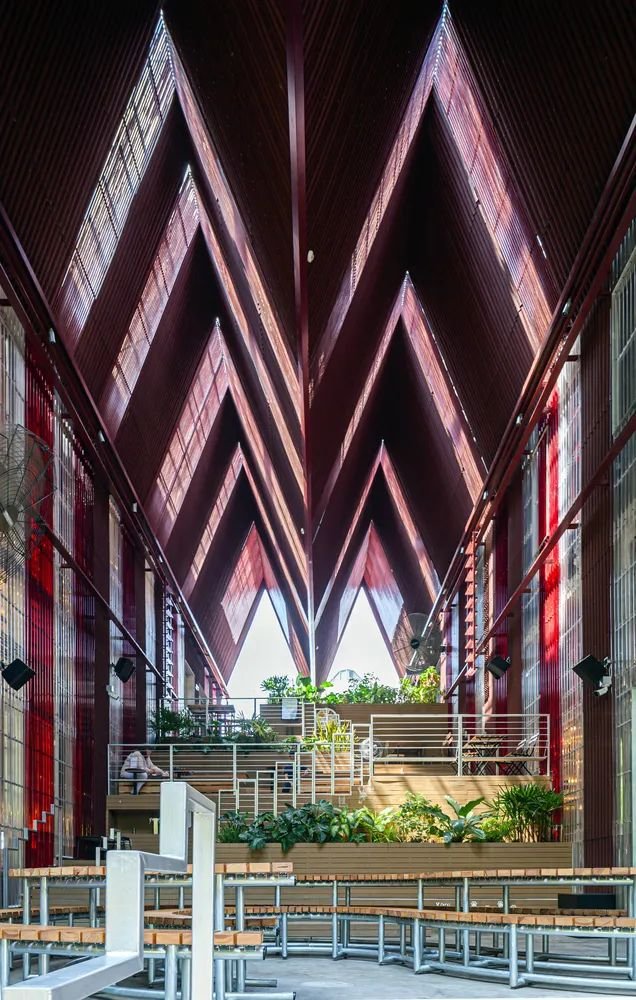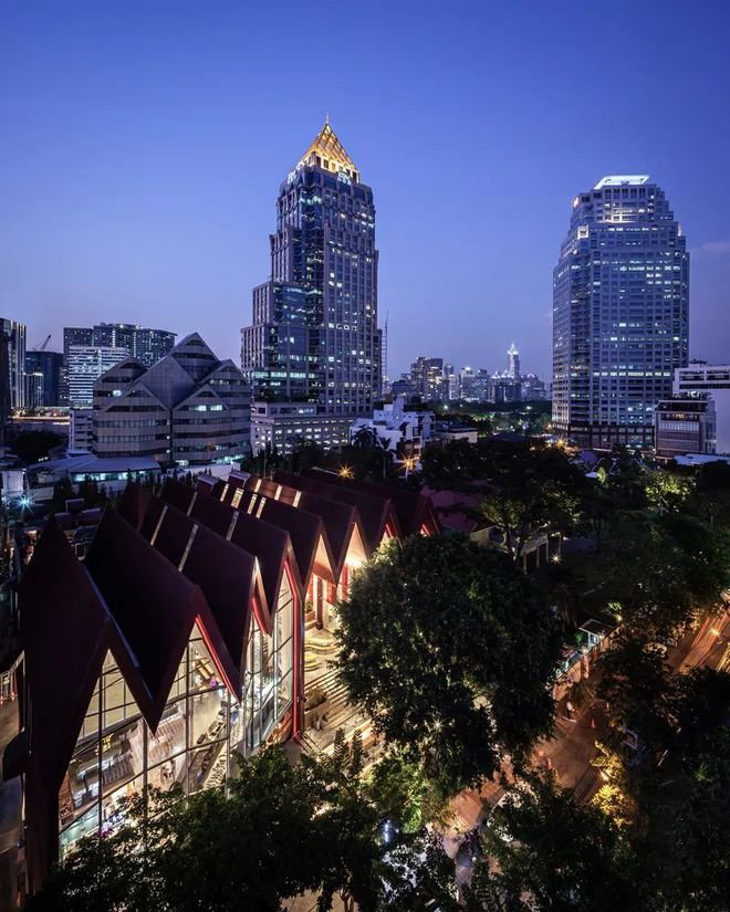 the COMMONS Saladaeng外观最引入瞩目的是整片的红色屋顶,灵感来源于19世纪末,该地区火车站台亭子红色的屋顶。