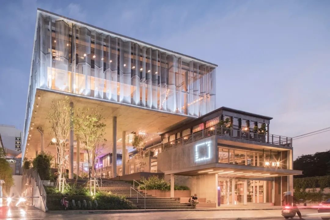 远远望去,the COMMONS Thonglor裸露的混凝土结构外松散地包裹了一层透明的立面。这层立面给厚重的混凝土结构带来了轻盈通透的感觉。到了晚上,冷白光从底部打亮了立面,与室内透出的暖白色光线形成了对比。