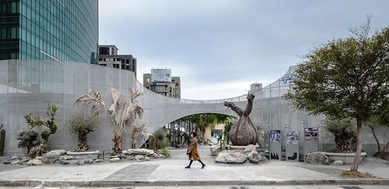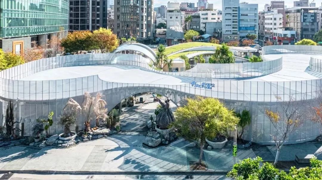 商业体涵盖1F、B1两层楼,建筑采用半穿透性铝网,通过不规则蜿蜒的廊道,分隔内外空间,并创造出许多能停留的空间,既方便自然采光,又能充分融合绿植。