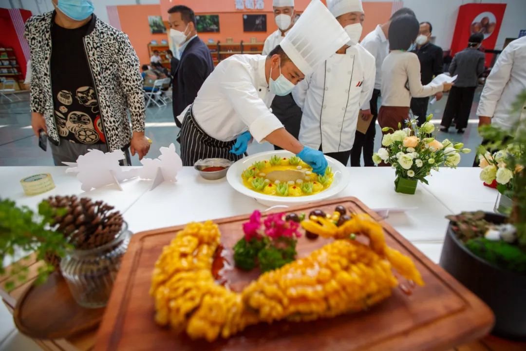 9月26日,鱼王文化节开幕前,厨师对展示菜品做最后的布置。