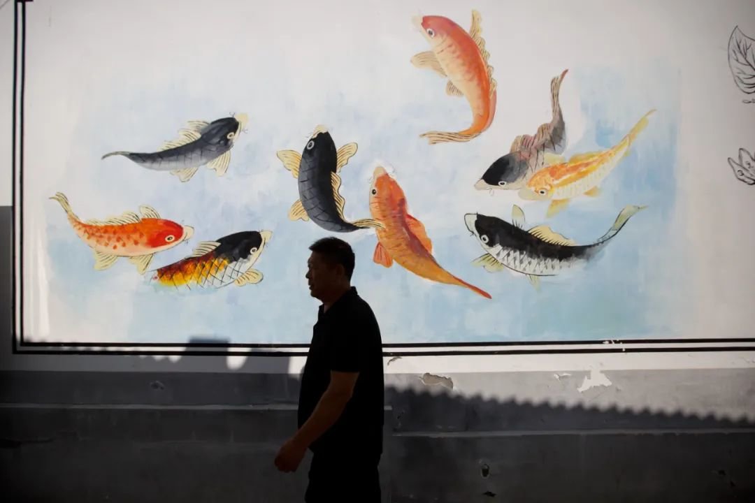 9月14日,荞麦峪村,渔民郝加银走过自家农家乐门前。他们家特意将鱼画在门前的墙面。