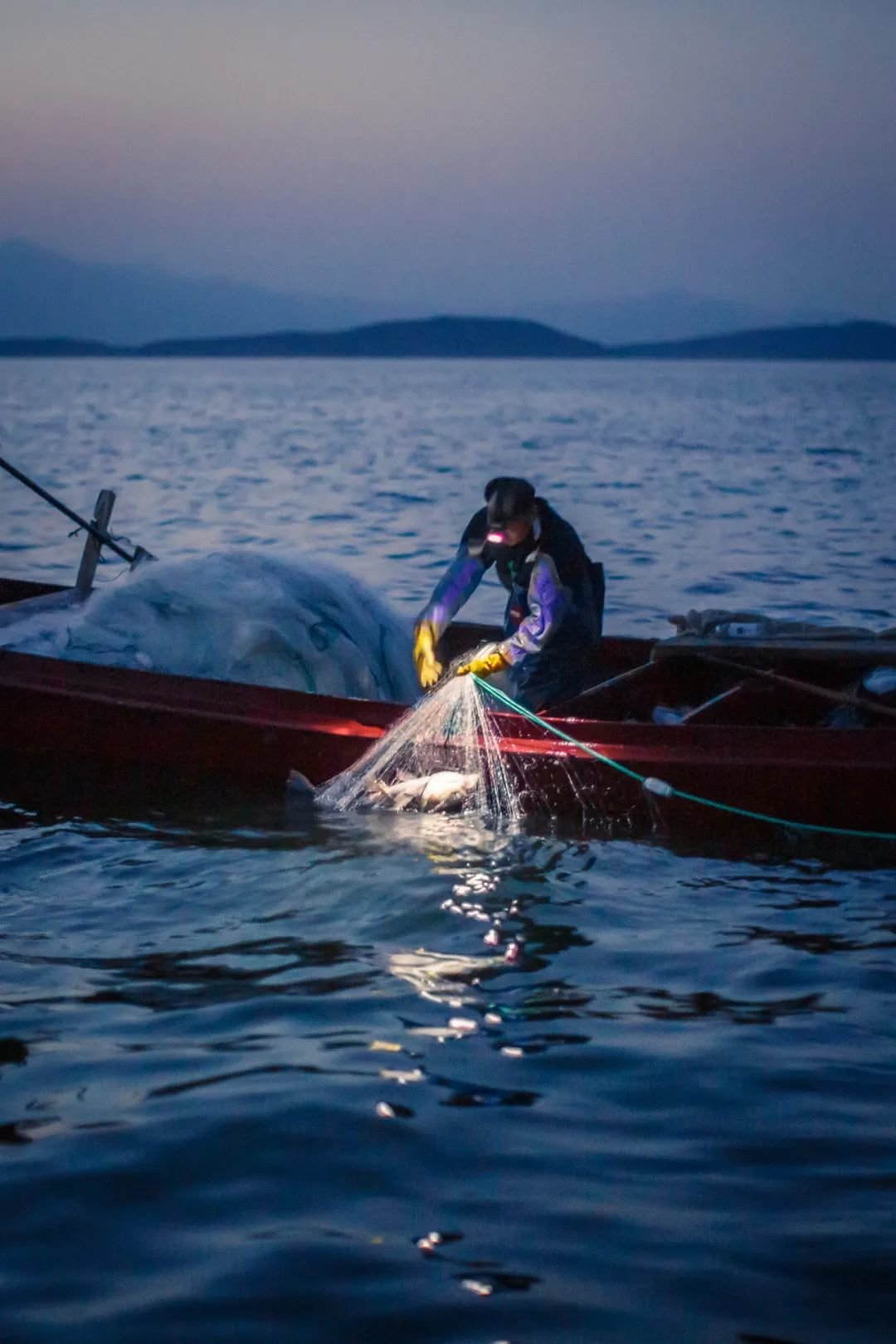 进入捕鱼季,渔民通宵捕捞是常事。一艘约八米长、一米半宽的小船,需要两个渔民共同操作,他们在茫茫水域上互相依靠。