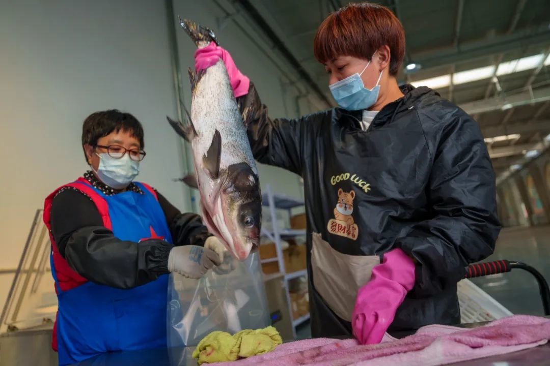 10月12日,王洪烨的同事将宰杀完毕的鱼放入塑料袋便于抽真空。