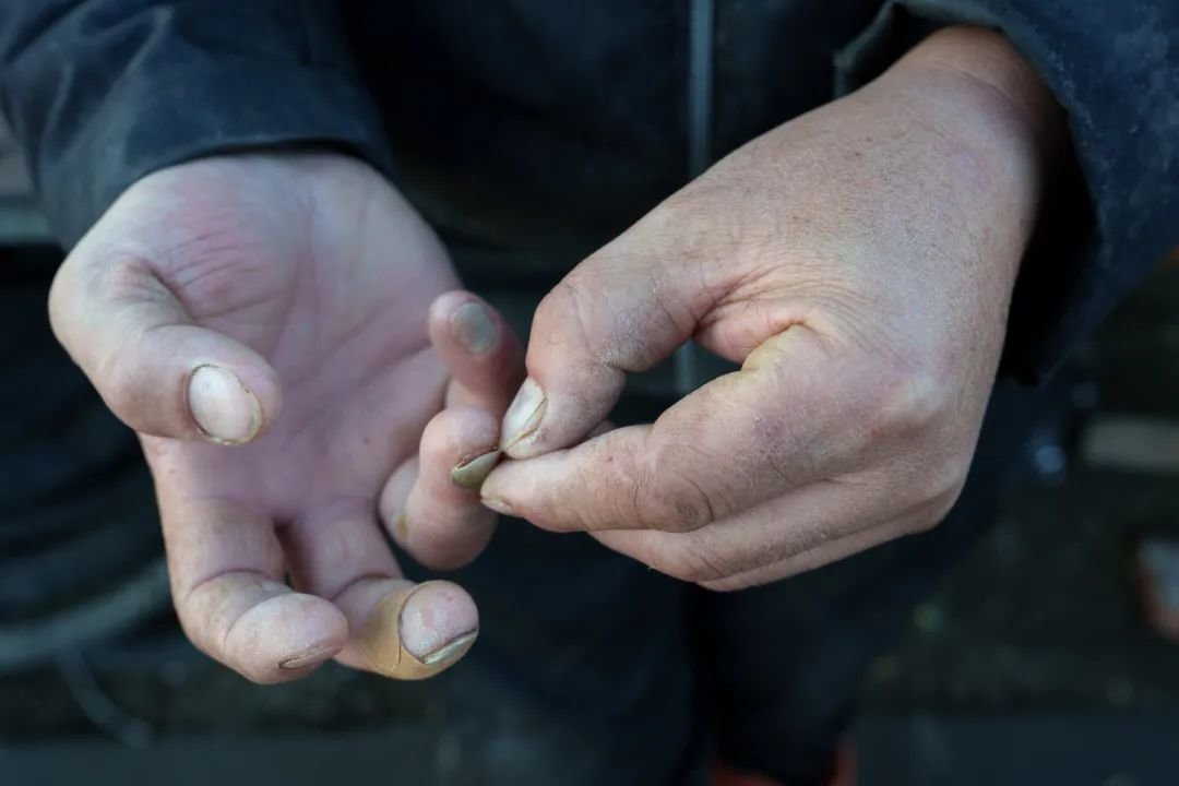 10月9日,郭小超的搭档在检查自己手指甲,长期拉网导致伤口一直没能愈合。渔民的手指更粗,手掌更厚,手上遍布伤痕。