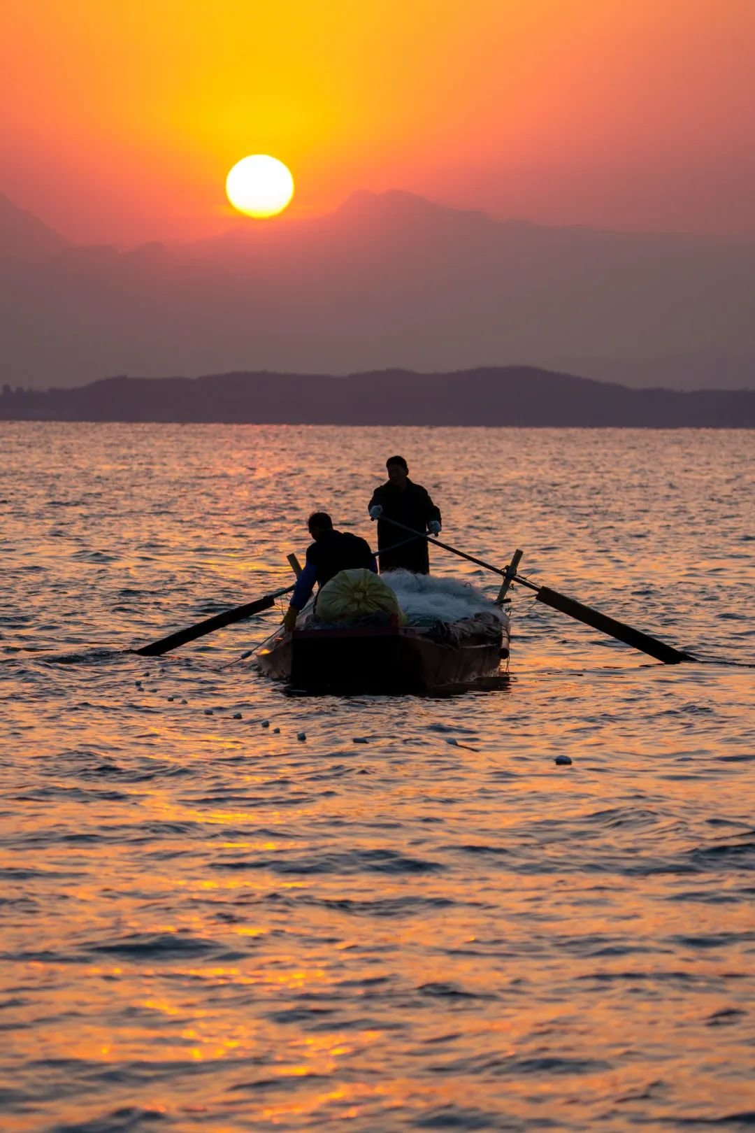 9月25日清晨,太阳升起,渔民划船返航。