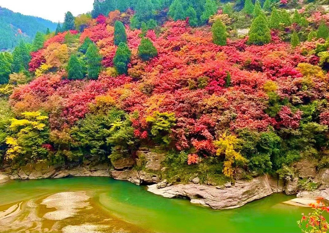 还有当年中学课文,著名作家杜鹏程写修建宝成铁路《夜走灵官峡》的真实地点,山坡上星星点点的红叶开得正盛,真是美不胜收。
