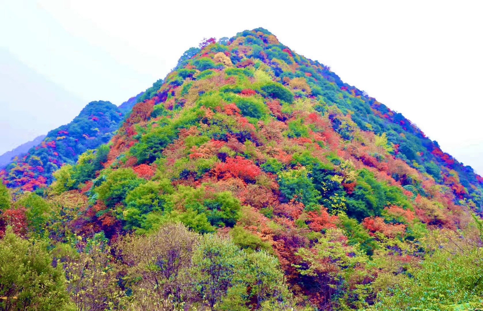 秦岭以南的山区,主要景致是针叶、阔叶林参差不齐,针叶林忠贞的苍翠依然如故,而阔叶林不是黄了就是红了,色彩尤为绚丽多彩。