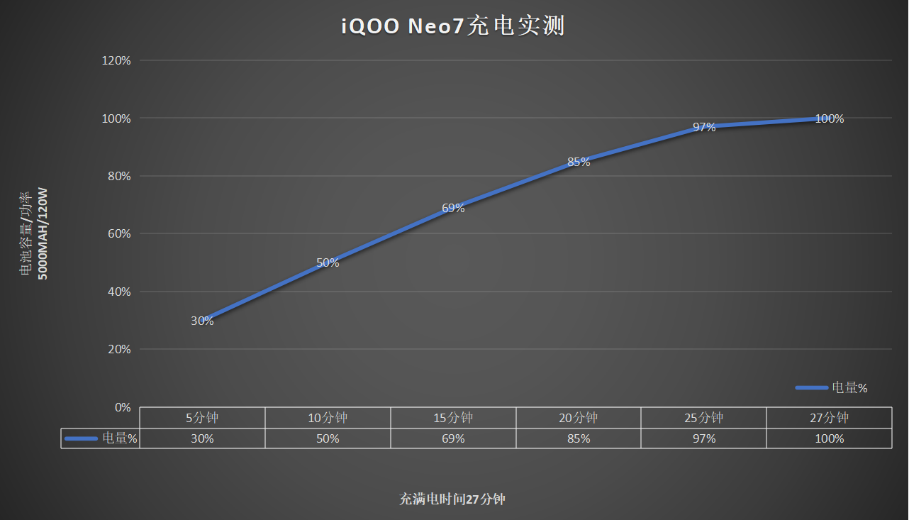 当下人们使用手机的场景变得越来越多,如此一来手机的续航能力便受到了考验,为了缓解大部分人们的续航焦虑,此次iQOO Neo7搭载了一块容量达到了5000mAh 的大电池,有效延长了手机的续航时间,让用户可以彻底跟续航焦虑说再见。此外,iQOO Neo7还加入了120W 超快闪充,结合全新极速模式,在充电方面也给人们带来了绝佳体验。从下图可见,当手机接入充电器之后,仅需5分钟电量就能从0恢复到30%,只需要27分钟,也就是不到半小时的时间,手机电量便能恢复到满血状态。不得不说,iQOO Neo7这个充电速度比很多旗舰机都要快上不少。
