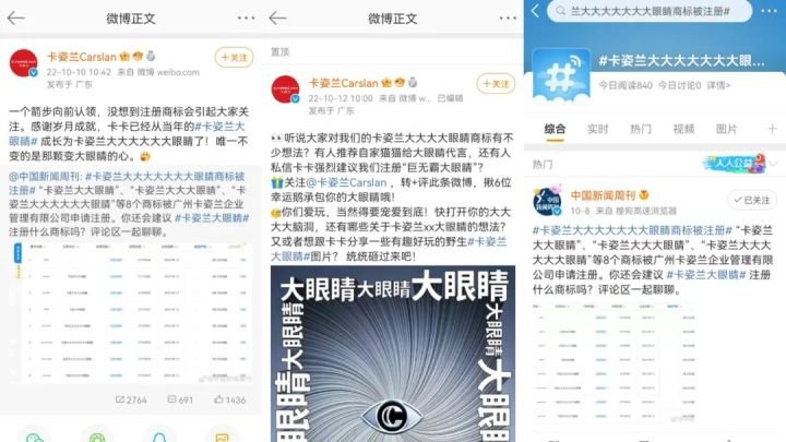 “卡姿兰大大大大大大大眼睛商标被注册”微博话题获得了1696.8万次阅读,参与讨论次数也达到一万次,话题热度的高涨让卡姿兰Carslan官博都主动出来“认领”。此次讨论将曾经的国民记忆“卡姿兰大眼睛”再一次带入了人们的视野,幽默的商标名称,官博的及时互动,拉近了品牌与消费者的距离,使得不少网友在相关微博下争先评论。