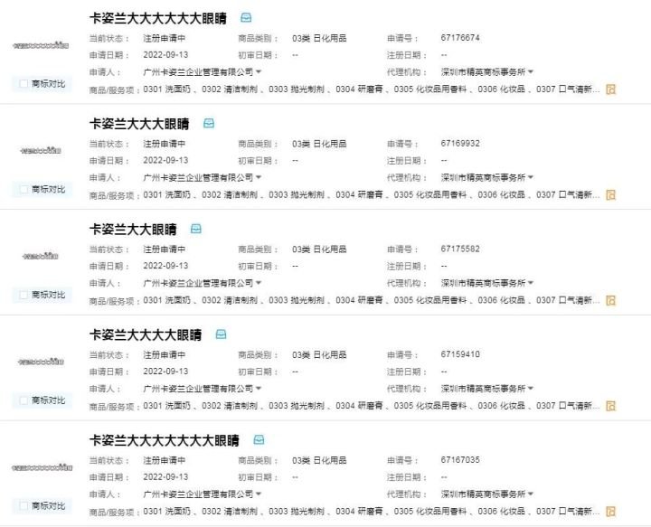 9月13日,广州卡姿兰企业管理有限公司密集提交8项商标申请,据中国商标网显示,除其中一项因正在受理中无法展示,其余七项均为与“卡姿兰大眼睛”相似的商标名称,且目前均处于等待实质审查阶段。