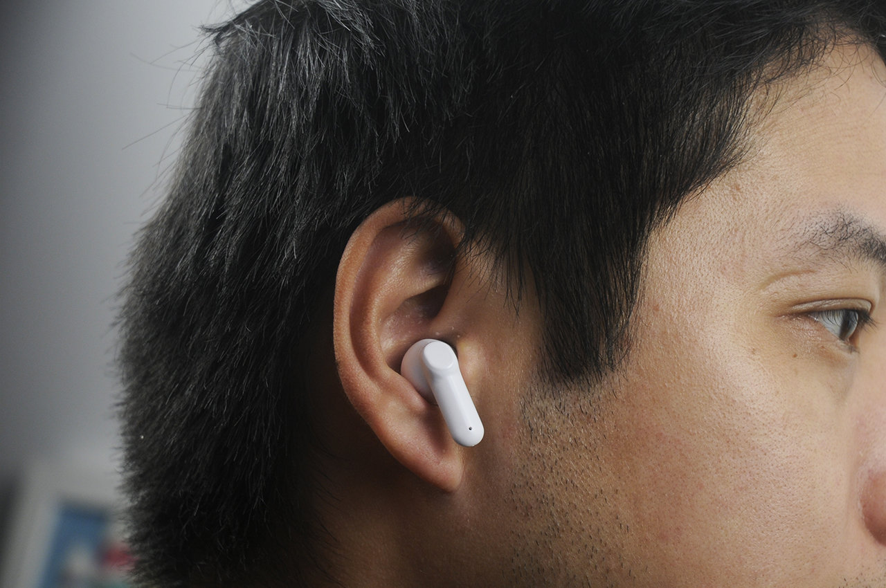 耳机采用挂耳式佩戴方式,而且耳机的本身个头也相对比较小,同时他所采用的Buoyancy人体工学设计在佩戴的舒适度上还是比较不错的,加上3.1克的重量的确更显轻便。