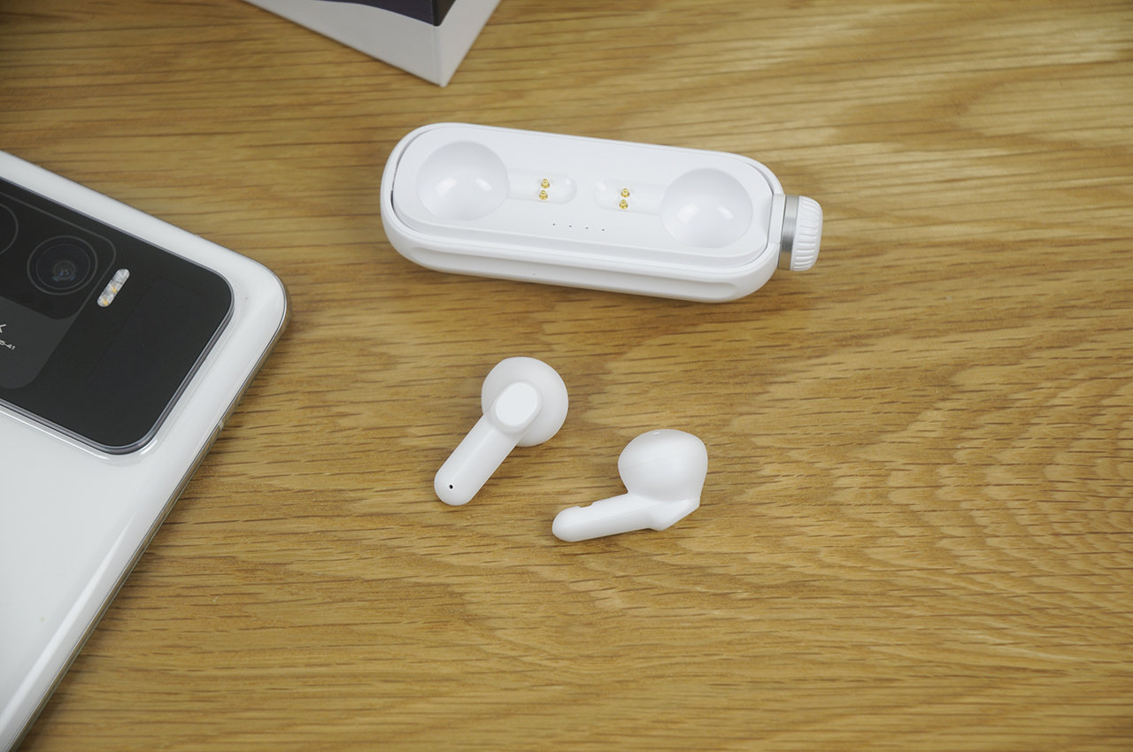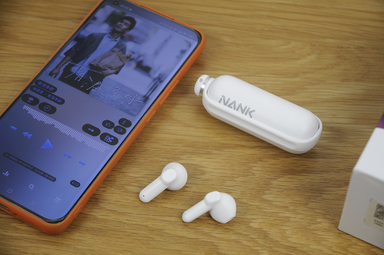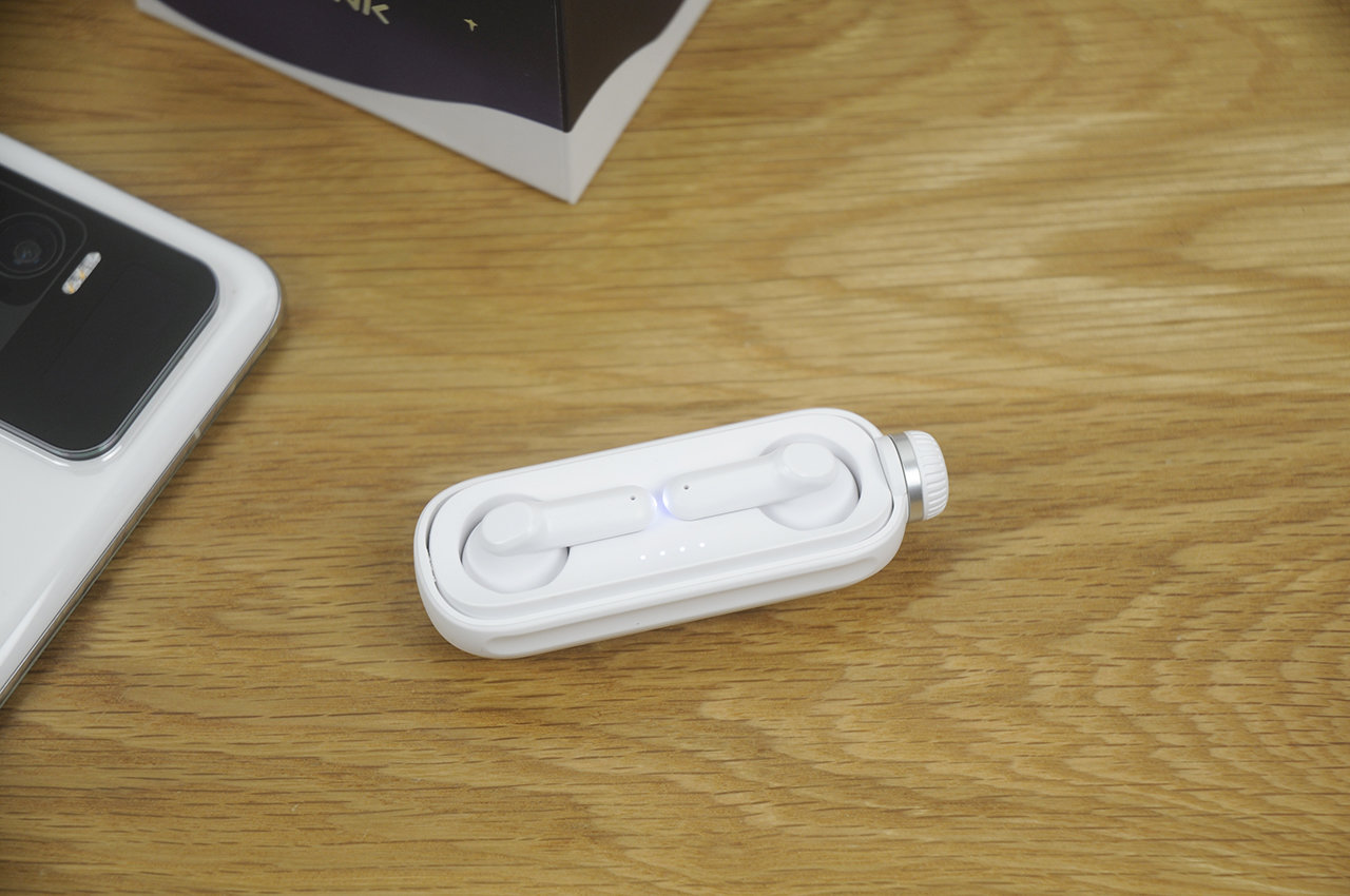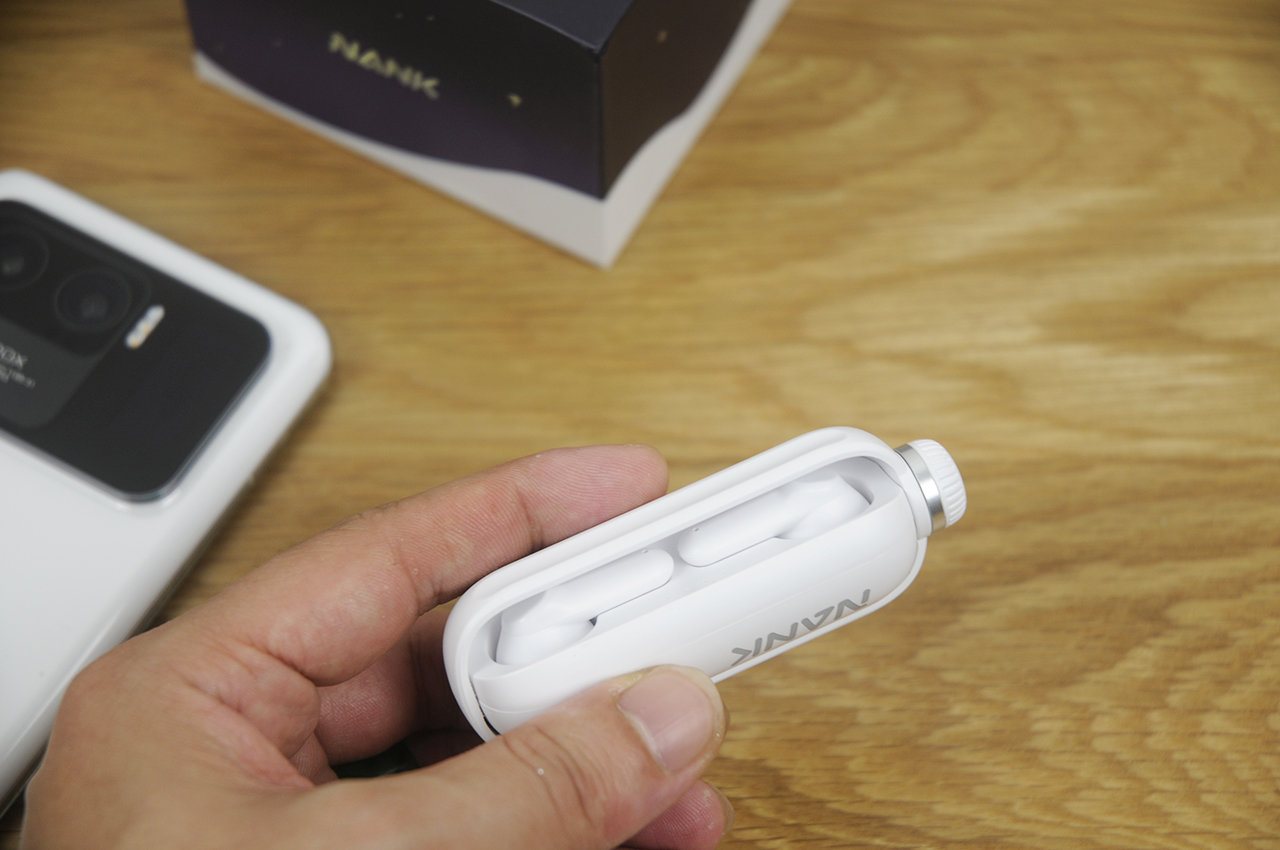 收纳仓的外形似乎像个大号胶囊,与传统TWS耳机的收纳仓想比也显得更加小巧,随机除了USB Type-C充电线还附带一根白色挂绳,可以从顶部穿起挂在背包上,这样的设计在我看来已经跳出了传统的设计思路,显得新奇又创新十足。