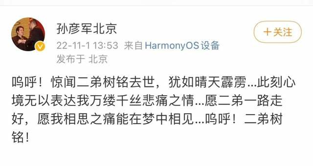 陆树铭去世后,刘备的扮演者孙彦军也发文哀悼:“愿二弟一路走好,愿我相思之痛能在梦中相见…呜呼!二弟树铭!”