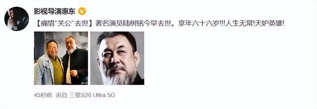 陆树铭去世后,圈中有不少好友纷纷公开悼念,导演惠东表示“人生无常,天妒英雄”。演员朱志刚、李泽明等都发声表达对陆树铭去世的哀悼。