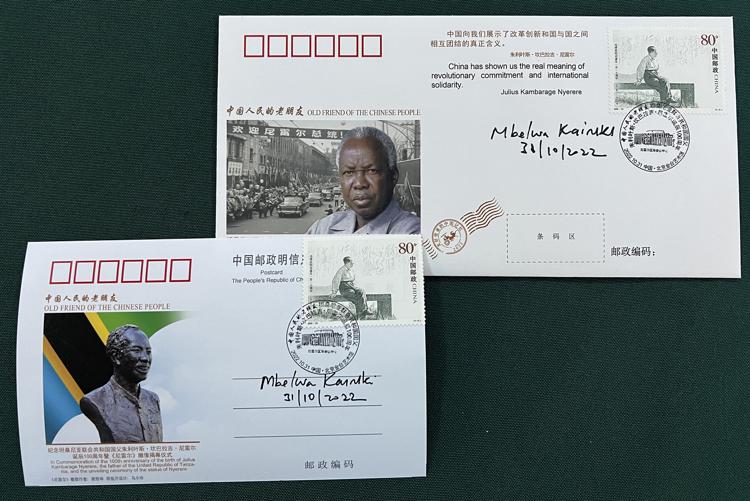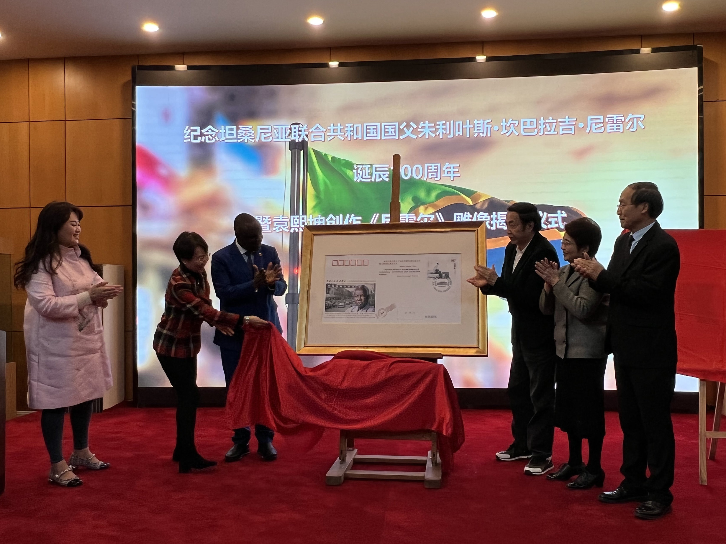 姆贝尔瓦·凯鲁基阁下、王克大使、许镜湖特使、袁熙坤馆长、马小玲副局长和罗肖副馆长共同上台为坦桑尼亚联合共和国国父尼雷尔诞辰100周年暨袁熙坤创作《尼雷尔》雕像揭幕仪式的纪念封和明信片揭幕,并签字留念。