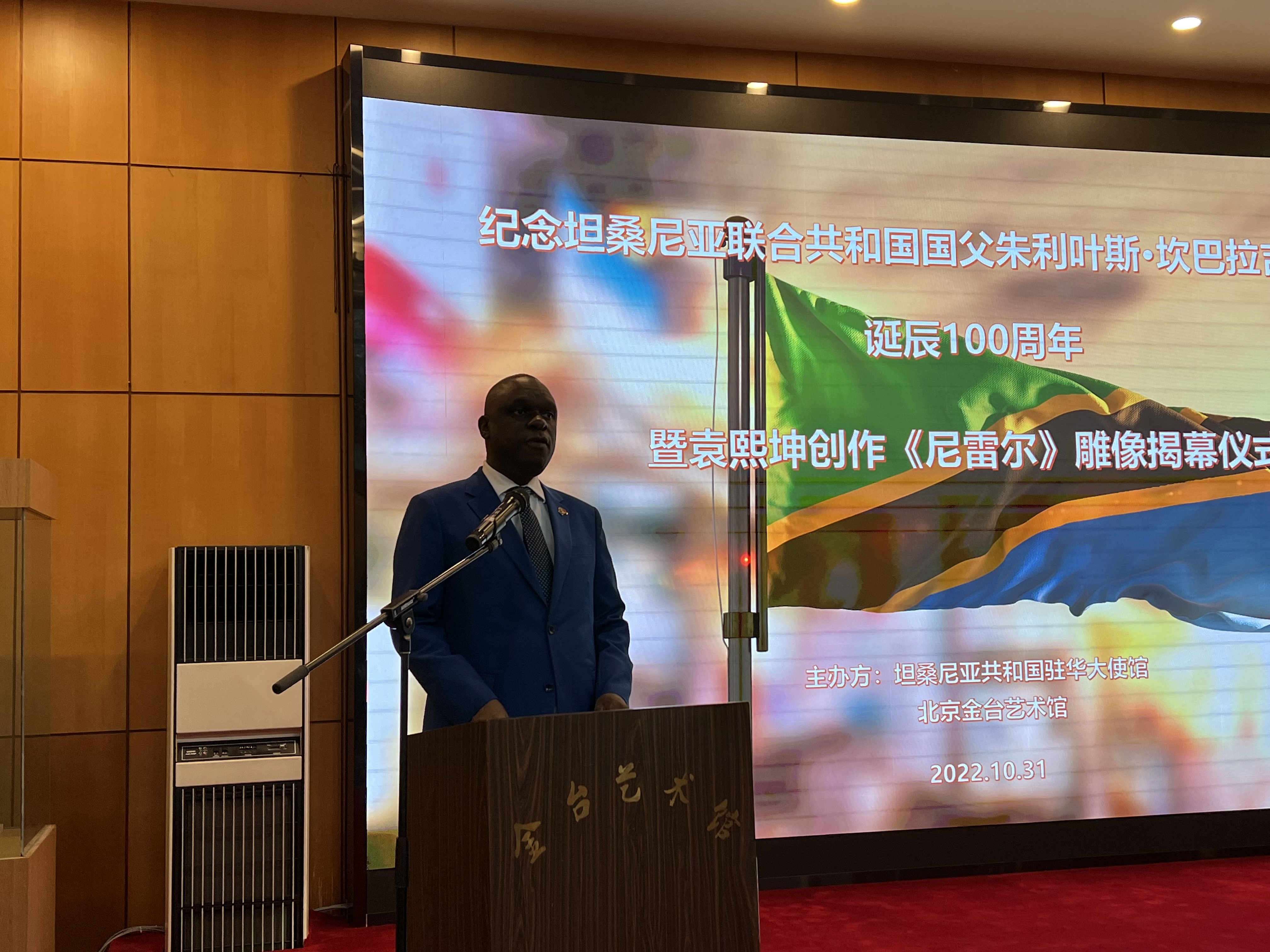 坦桑尼亚驻华大使姆贝尔瓦·凯鲁基阁下首先致辞,回顾了尼雷尔为中国和坦桑尼亚之间深厚而坚韧的友谊做出的积极贡献。他说:“我特别要代表坦桑尼亚联合共和国政府向袁熙坤先生表示衷心的感谢,他今天以其杰出的艺术才华为我们呈现了又一幅杰作。您的艺术创作生动地将我们所有人带回了我们两国人民永远不会忘记的最珍贵的记忆。尼雷尔的雕塑绝对是我国总统11月2日对中国进行国事访问的最好礼物。”最后,他表示将与在座的各位朋友一道努力为中坦友谊谱写新的篇章。
