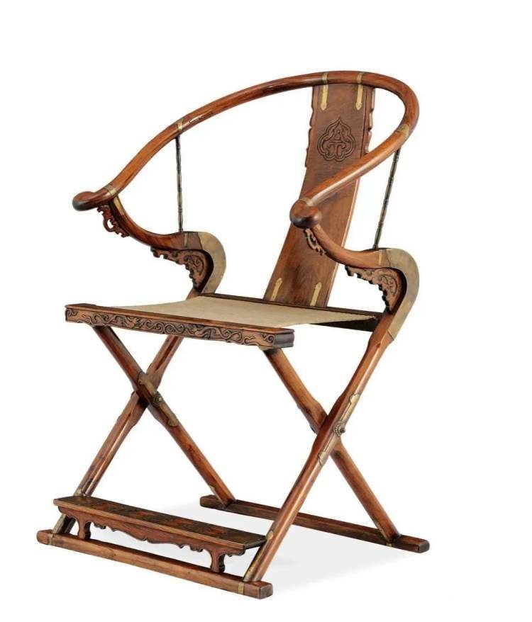在明代古典家具中,有交椅、圈椅、官帽椅三分天下之说。圈椅简洁,官帽椅典雅,而交椅则古朴拙趣、造型脱俗。交椅是家具中稀少且重要的品类。自宋以来,皇帝出行的大驾卤薄中,便有交椅,明清依然延续,如明代《大明集礼》、清代《皇朝礼器图式》等,皆有反映,帝王或官员画像,也以坐交椅为例程。在《乾隆帝岁朝行乐图》等清代的不同宫廷绘画中,我们也可以看到皇帝在行宫或者园林时,大多坐在交椅上,随从随侍左右。