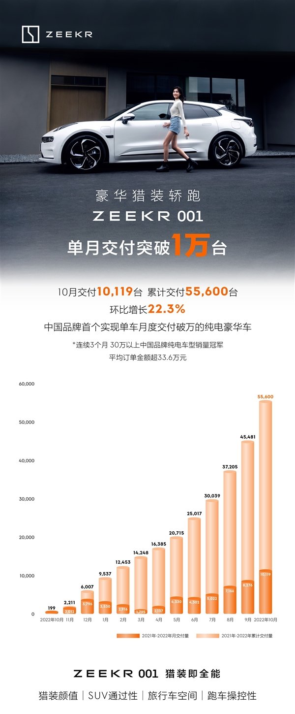 11月1日晚,极氪汽车发布了旗下首款车型001的上月销量,10月份,极氪001交付10119台,环比增长22.3%,值得注意的是,这是该车自去年10月份上市以来,首次月交付量过万,累计销量达到了55600台。