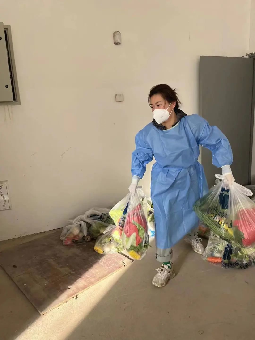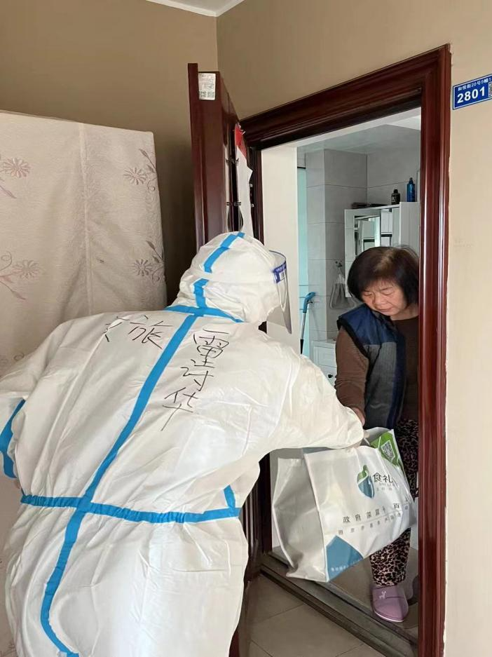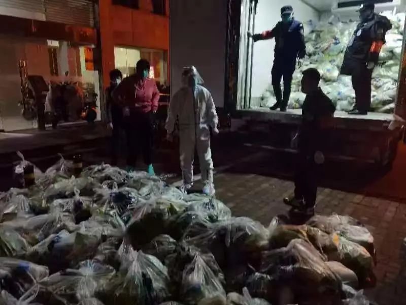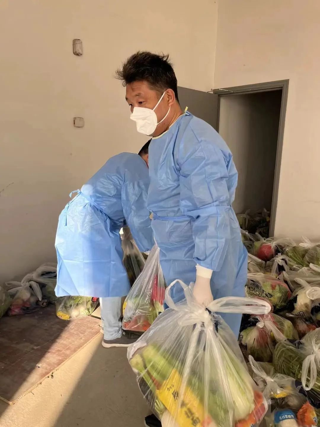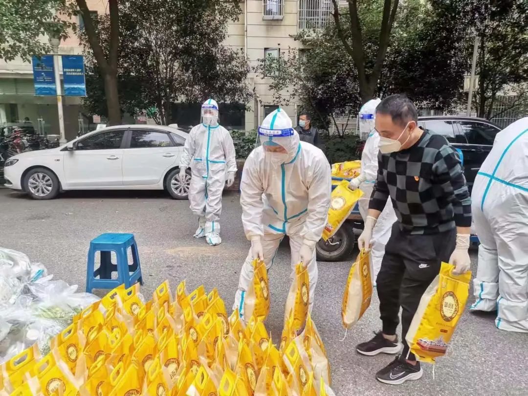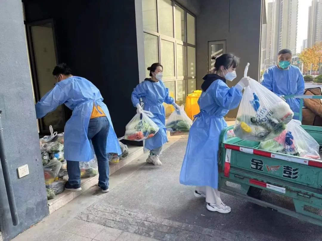 更“吃劲”的工作是发生活物资,大米或蔬菜,每次拿尽可能多的份数,肩扛、手提着上楼,再分送给有需要的群众。白天二十多度,穿着全套防护装备上下楼梯笨重而闷热。有时物资凌晨送来,需要人工“卸货”、码好,深秋的夜晚已颇有寒意,同志们却很快干得大汗淋漓。吴芸、张娇娇、房敏丽、王贞文、杨姣这些女同志们虽然看起来弱不禁风,干起体力活来却完全不肯输给男子汉们。除此之外,区文旅局的抗疫工作者们还要协助社区做好宣传引导、信息登记、应急事件处置等多项工作。