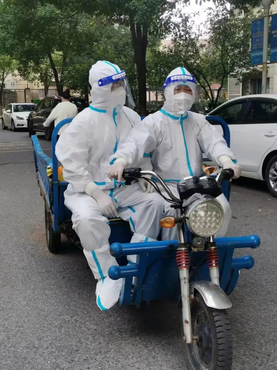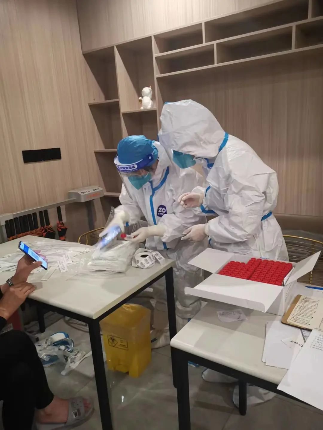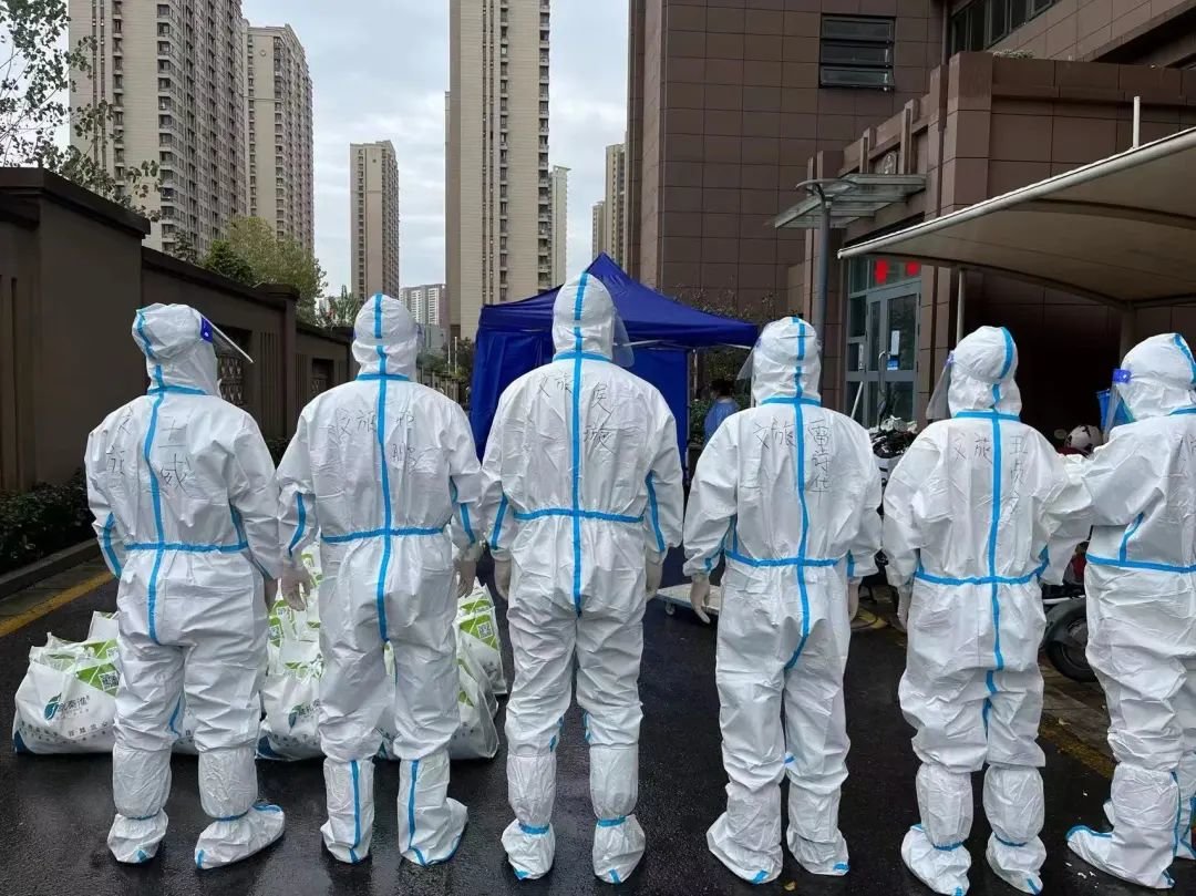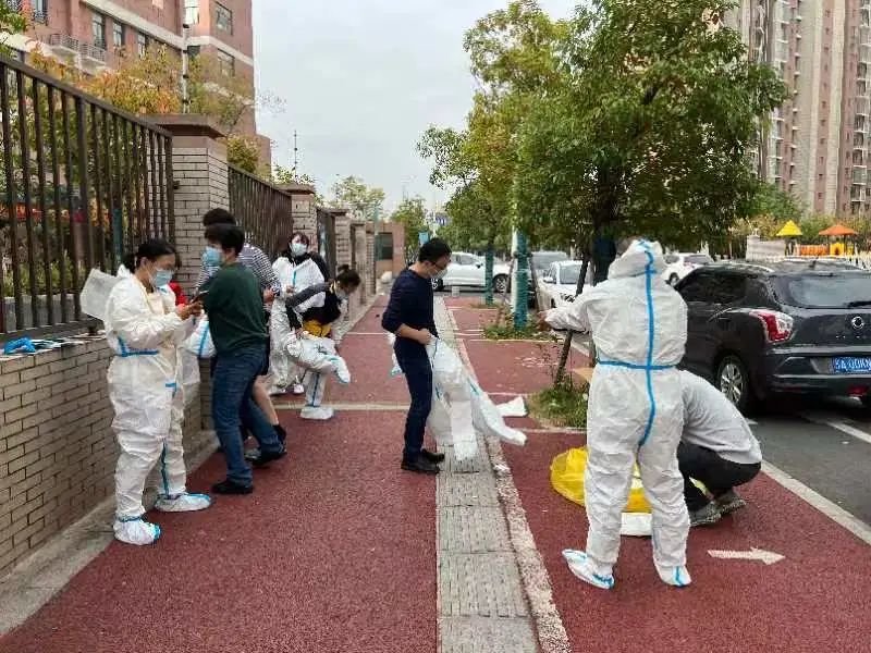 抗疫的同志们每天六点起床,匆匆吃过早饭,穿戴好防护服、N95口罩、防护头套、外科手套、鞋套等前往点位,开始挨家挨户敲门、提醒做核酸。对于红码人员、行动不便的群众,则要记好门牌号,稍后带领医务人员再次上门,并做好扫码、协助完成核酸检测。待负责片区的群众全部完成检测,通常已经下午一点以后,工作人员才能到指定地点脱掉防护装备、消杀,就地吃盒饭午餐,再换上新的防护装备开始下半天的工作。
