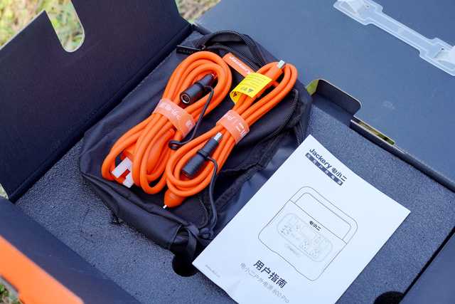 除了电源以外,官方还附赠了一个专门的配件收纳包,打开收纳包,可以看到电小二标配了一跟车载充电线和一根墙充AC电源线以及一根DC7909转DC8020接头。值得一提的是,Jackery电小二此次取消了电源适配器,取而代之的是一根极简的电源线就可以完成充电,变得更加方便了。