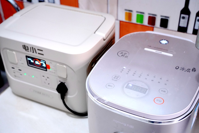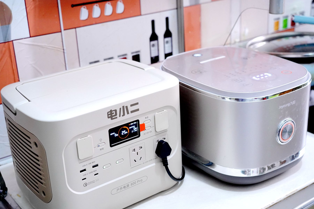 一般的小功率电器,是完全没问题的,考验户外电源的能力,就是它的峰值功率,接下来,我们来实测一下,这款电小二户外电源800Pro是否可以带动功率更大的电器设备,我家的电饭煲的功率为1000W,而电小二户外电源800Pro,支持800W持续功率输出,峰值功率可以达到1600W。所以,理论上是可以带的动我的电饭煲的,经过测试,在开启煮饭模式后,电小二户外电源800Pro确实可以非常稳定的运行,表显功率也在随着电饭煲的启动,在1000W左右波动。