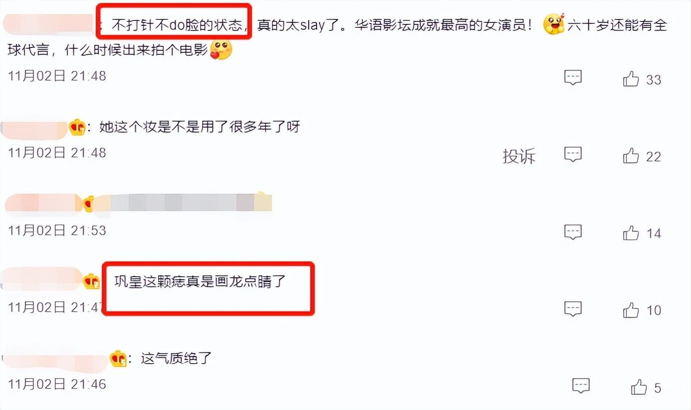 面对这次巩俐的露面,网友们也觉得惊喜万分。有人在评论区感叹巩俐的状态真是绝佳,作为华语影坛成就最高的女演员,还能拿到全球代言,那真是相当厉害。更有眼尖的网友把注意力放在巩俐的这颗痣上,认为它起到了画龙点睛的作用。