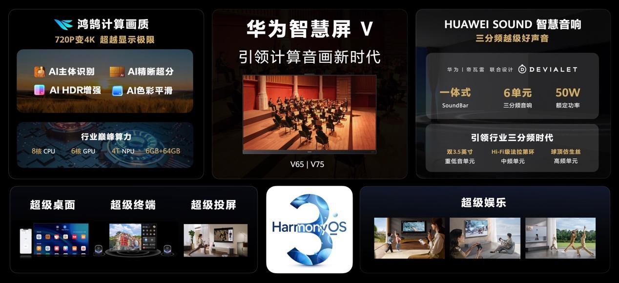 无计算、不高端,计算能力是高端电视的分水岭。华为智慧屏 V 3代有很多令人眼前一亮的技术创新,包括“计算画质”新一代画质技术、HUAWEI SOUND计算音频技术等等,可以看出华为雄厚的技术实力。