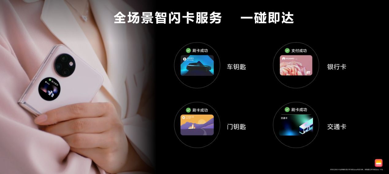 大家都知道,华为钱包可以绑定车钥匙、智能门锁钥匙、门禁卡、交通卡、箱包钥匙等智闪卡。现在,随着Pocket S的发布,以后我们在使用手机刷卡时,可以通过外屏选择所需卡片。当然,新升级的华为钱包同样可以智能识别场景,主动调出需要的卡片。