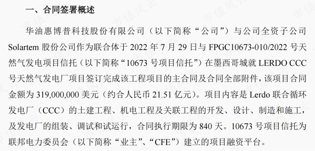 2022年8月2日,惠博普发布了签订重大经营合同的公告,该合同金额为3.19亿美元,约合人民币21.51亿元,占2021年营收比重为134.92%。