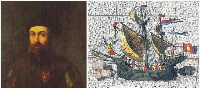 左:麦哲伦像。右:维多利亚号帆船是麦哲伦船队中唯一完成环球航行的船只,该图绘制于1590年