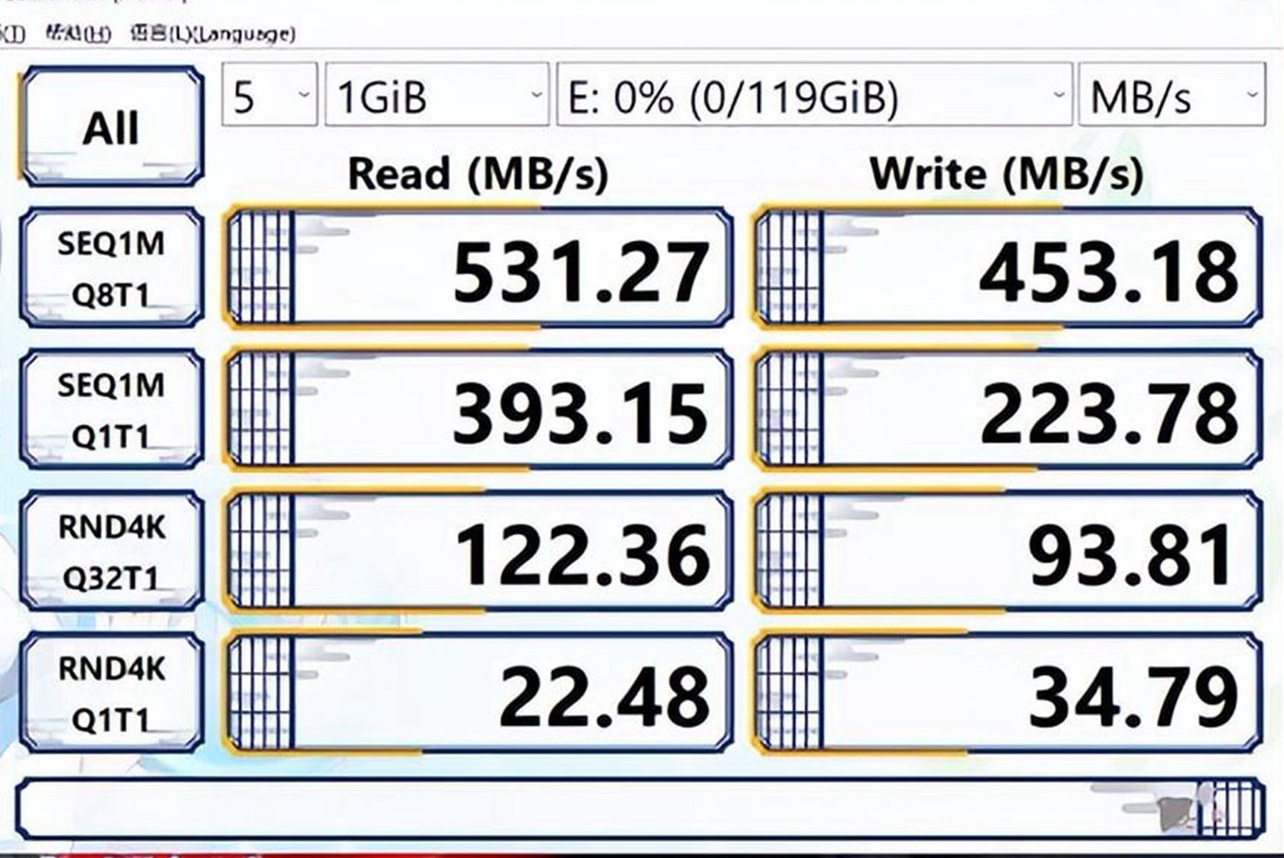 而在实际的Crystal Disk Mark软件测试中,aigo U393高速固态U盘却能够给出读取速度为531.27 MB/s、写入速度453.18 MB/s的优秀成绩,得出的结果比官方还要高出一些。如果配合Pro的雷电4接口传输,相信它的高速传输性能,绝对不亚于掏钱选购更大内存的版本。