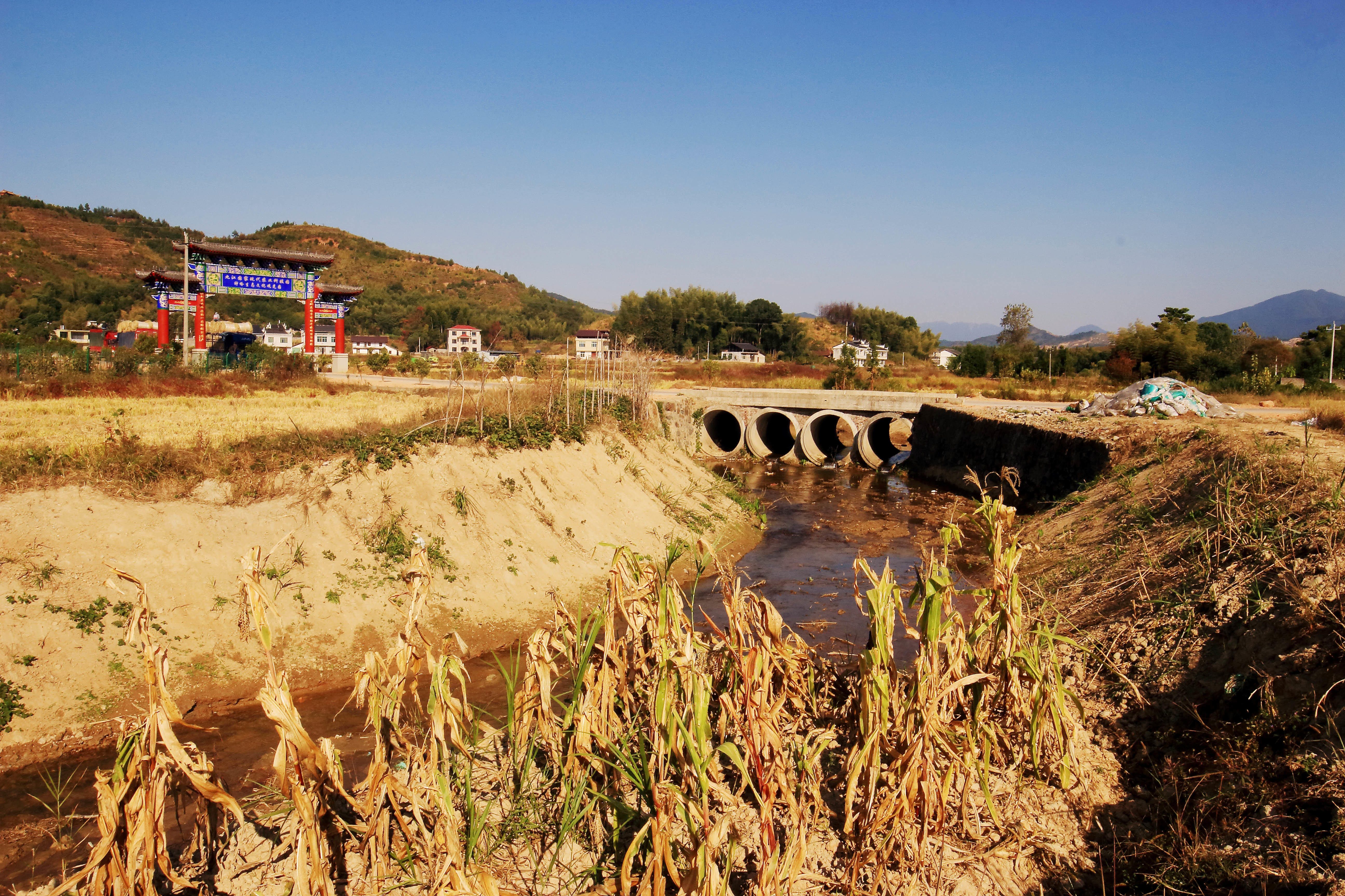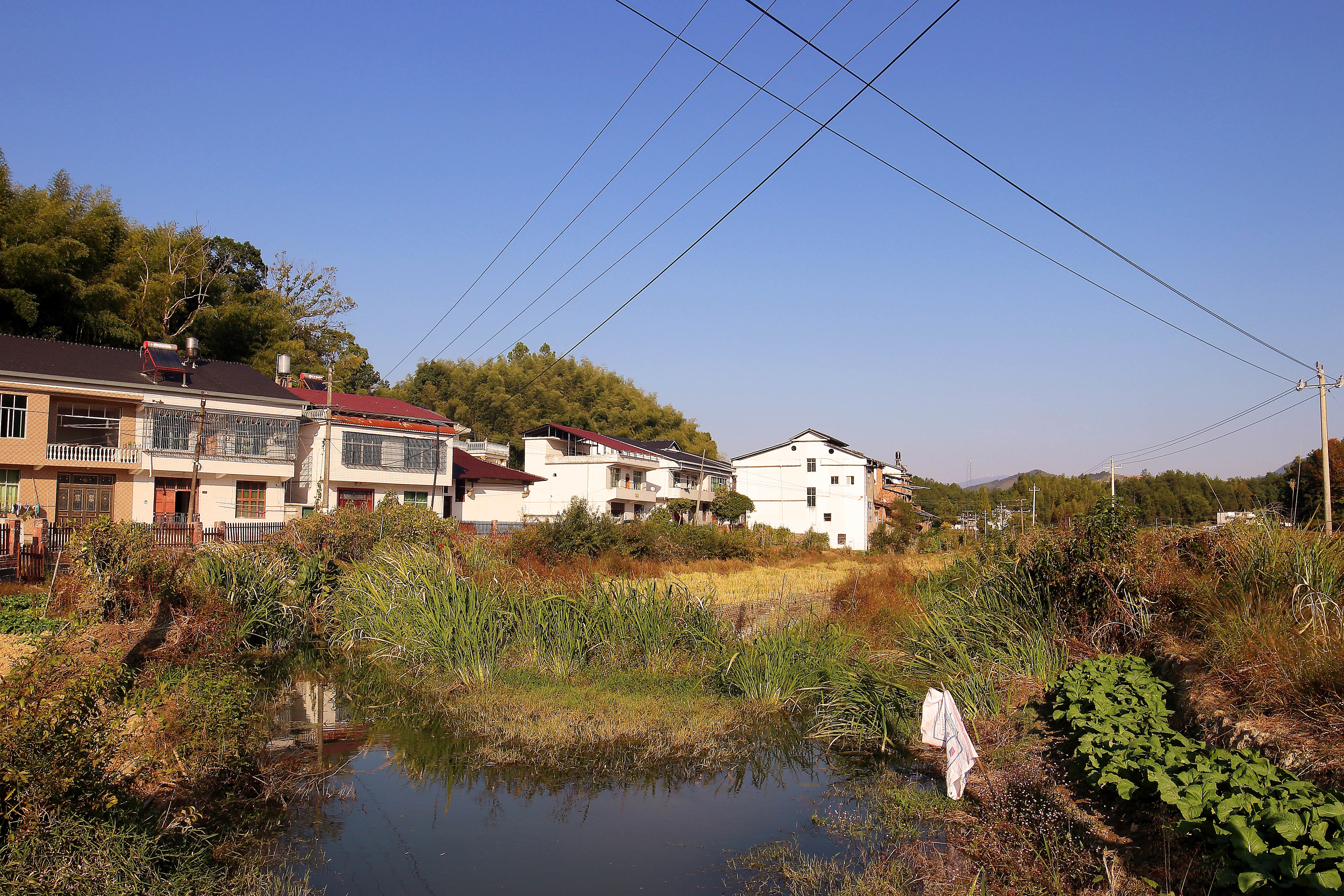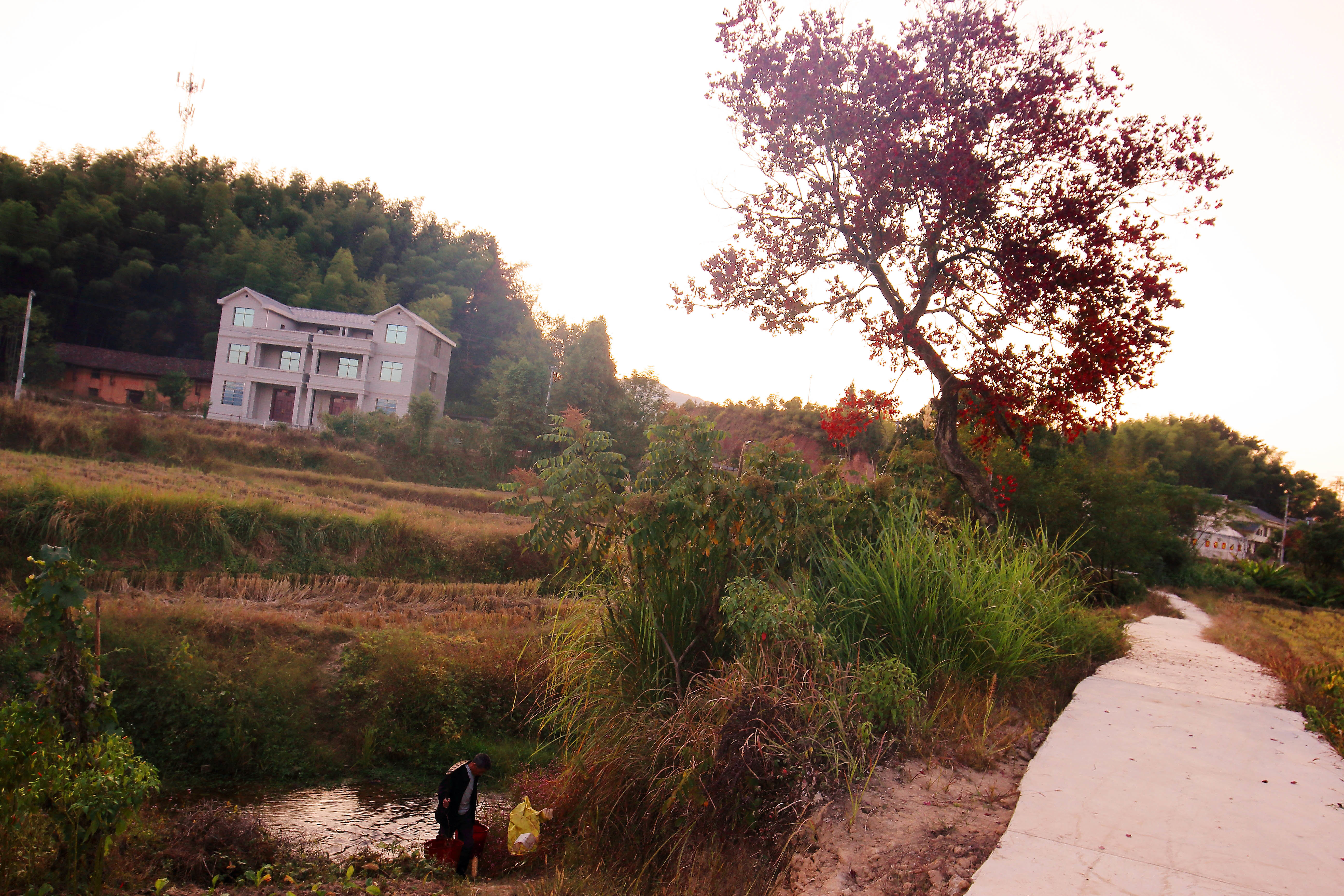 范浆村的村中心点,有第二次栏的水坝,水灌溉着两边田地。河边乡亲的人家,国庆节娶亲的喜联,飘动在风中。