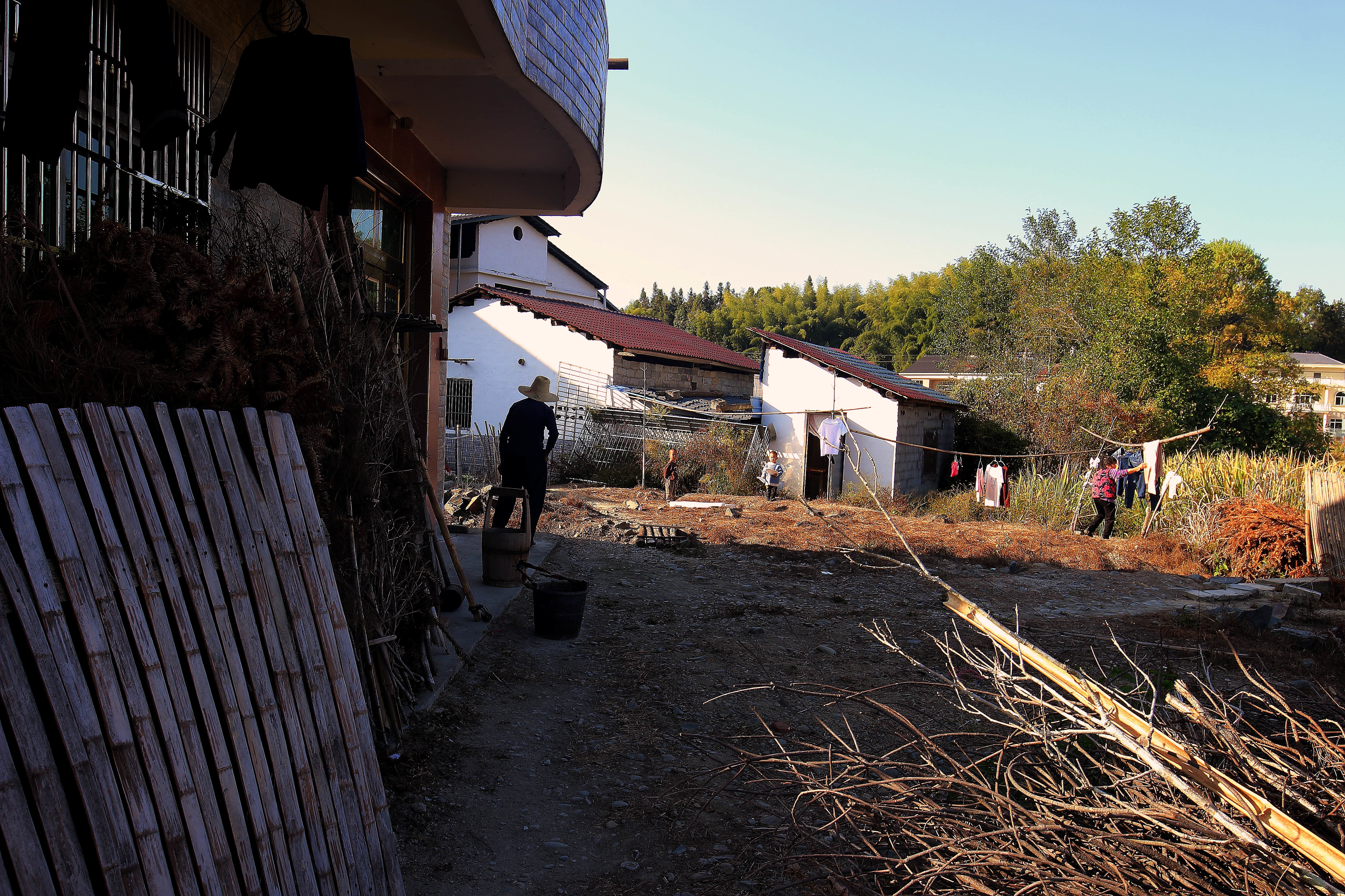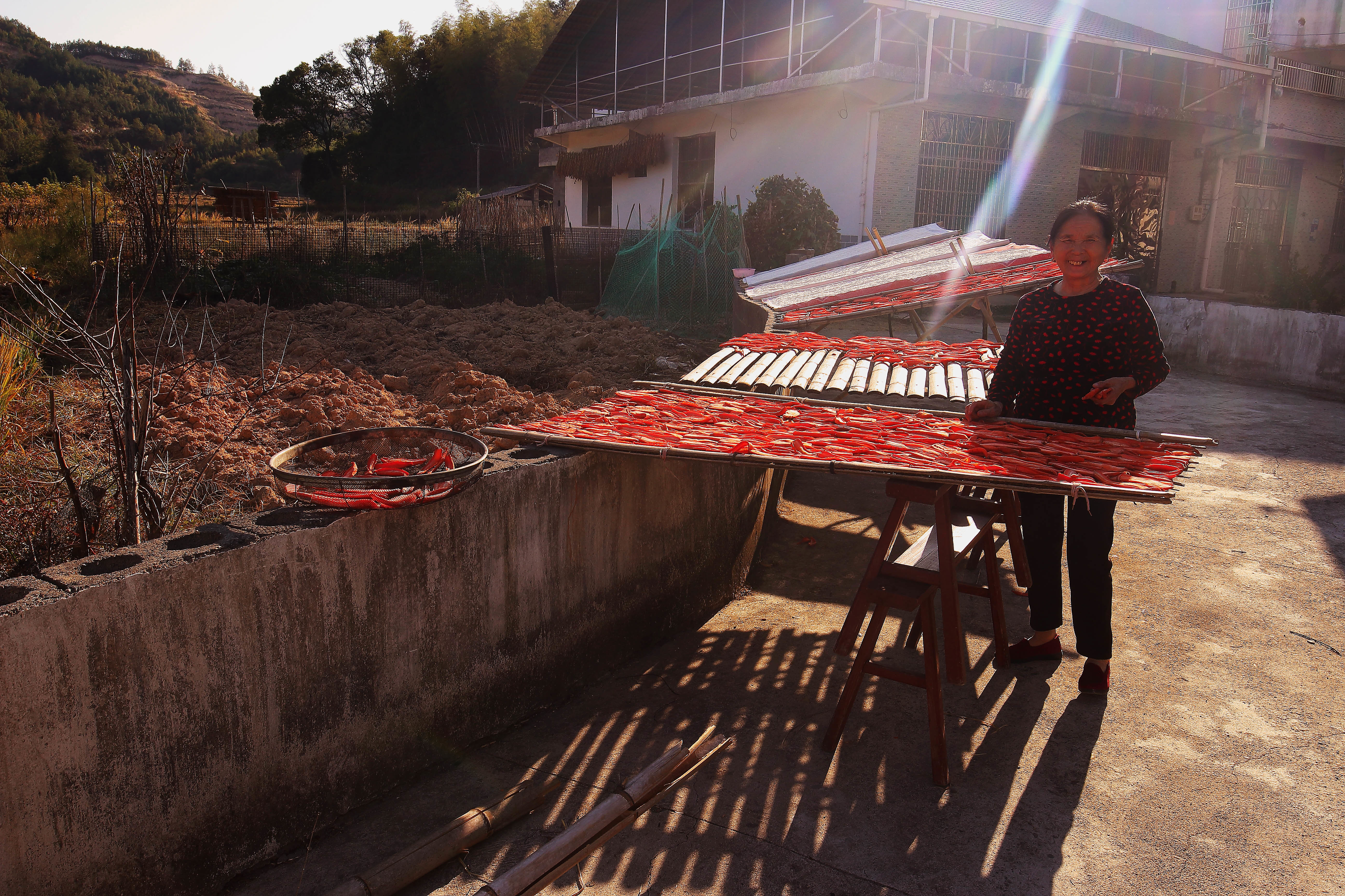 先从门前河开始,时间就选霜降节气,天气渐寒始于霜降。《逸周书·周月》: “秋三月中气:处暑、秋分、霜降。”秋天最后一个节气,家乡的习俗,到了霜降节该收的要收进,要晒的就要晒。在范浆村寻找门前河源头时,大妈见我拿相机感到奇怪就问: “你在拍什么?” 。我说: “我拍门前河。”她笑了: “门前河有什么好拍的。” ,叫我帮她拍摄一张,我就按下快门拍了三张,这是其中的一张,是她晒泡茶喝的胡萝卜,还有过年准备做哨子吃薯粉。