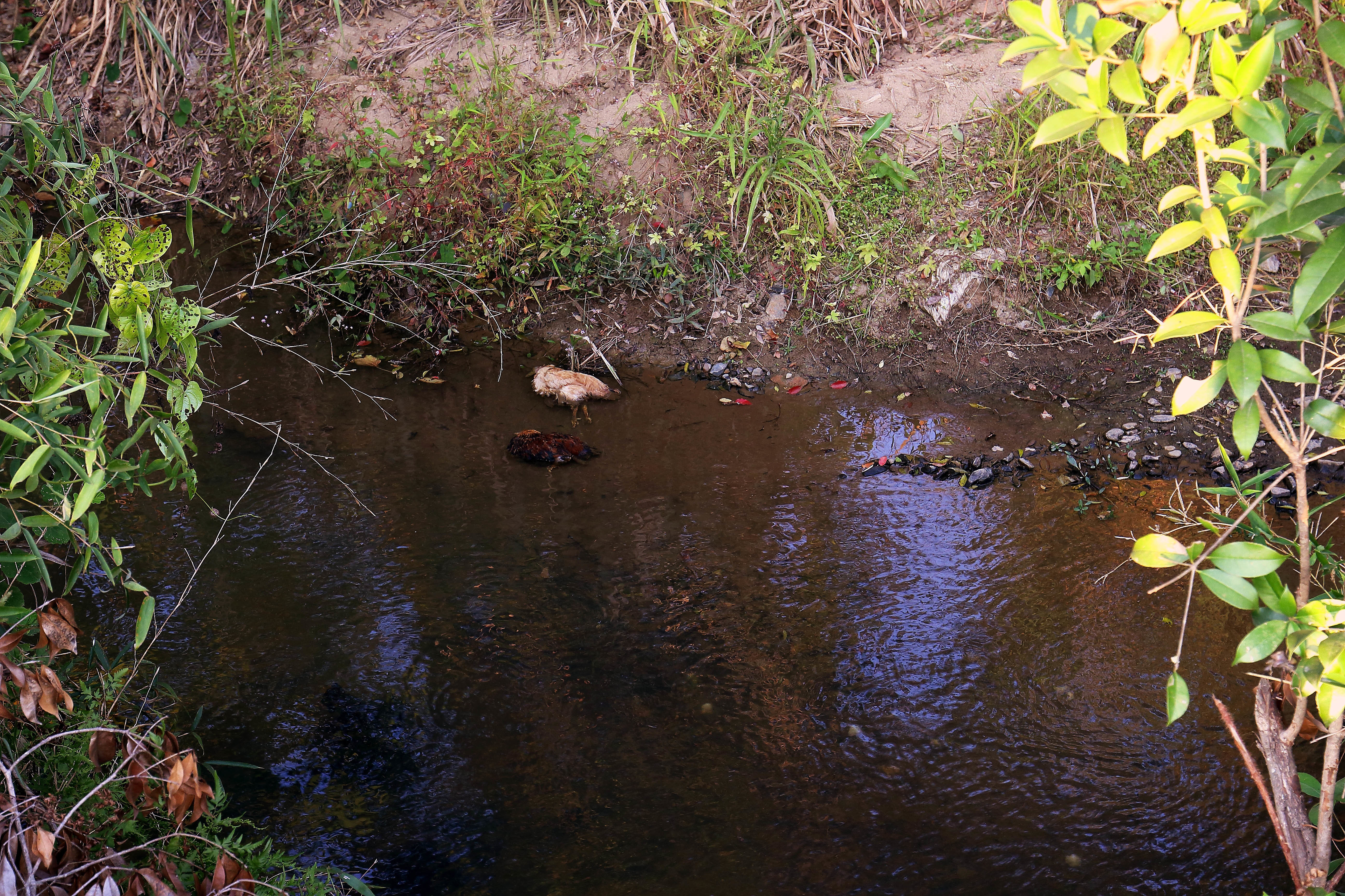 这里是第一次拐弯处,养的鸡品种不再是单一品种,现在已经是多样化了。鸡渴了,它们会到这条溪河寻水喝。