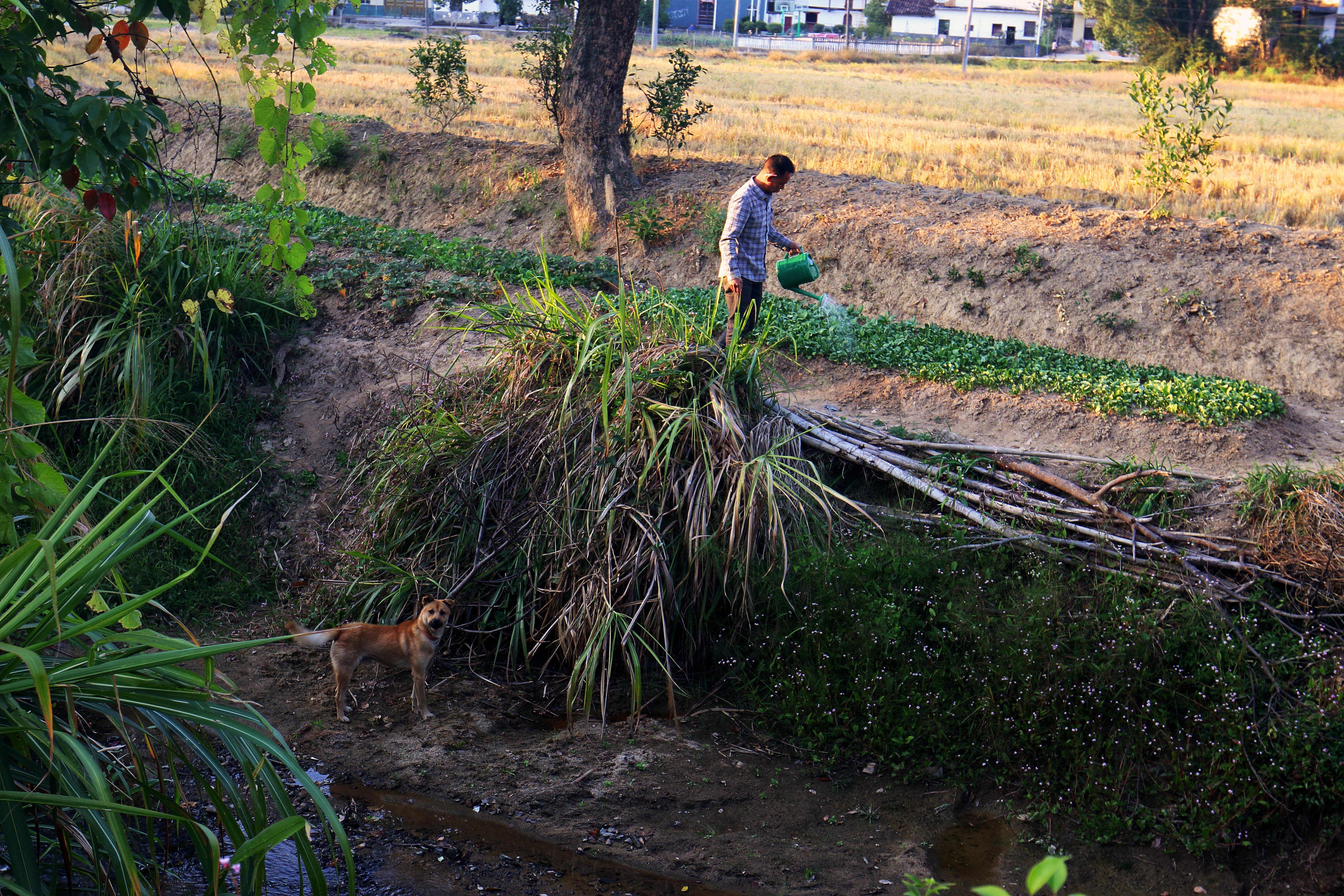 夕阳西下黄狗陪着主人,从门前河内取水,给青菜浇水。