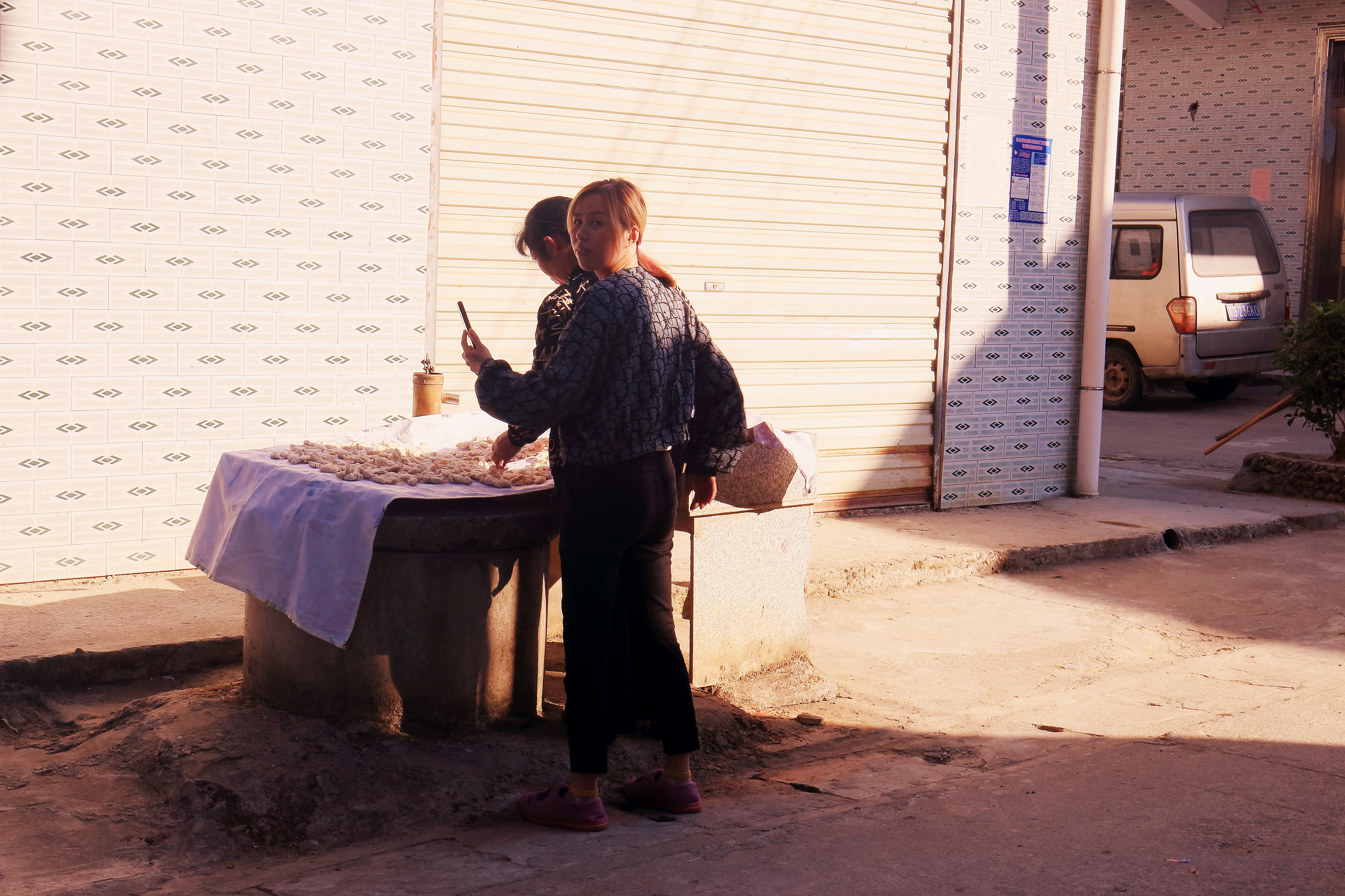 村里有俩女人,正在拍晒泡茶喝的生姜视频,被我打扰了,回头看我,似乎有些尴尬。