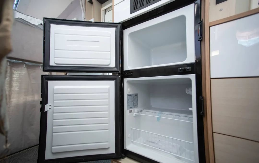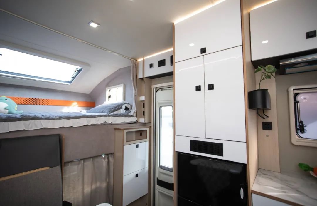 与会客区相邻的位置设有85L房车专用冰箱以及分体式储物柜,用于放置日常生活用品,满足储存食材的储物收纳需求。