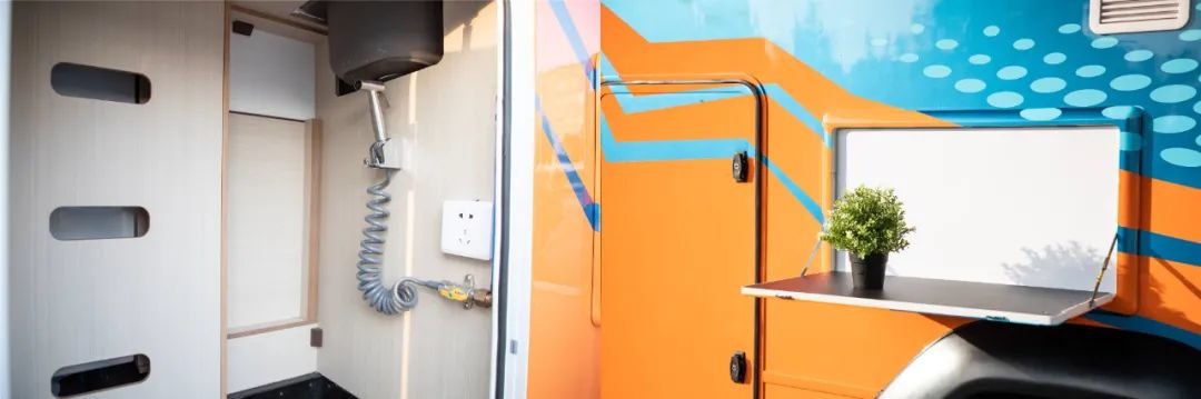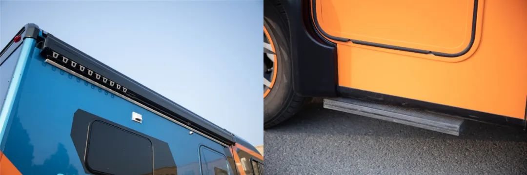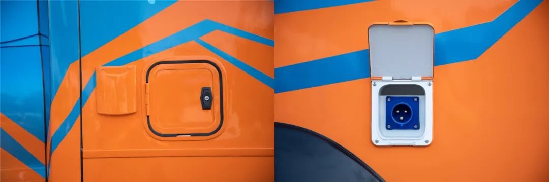 车身左侧则是配置了充电口、注水口、黑水箱取放口等基础设施;同时带有锁扣的外部舱门只需一把锁就能全部搞定,日常使用起来便利省心不少。