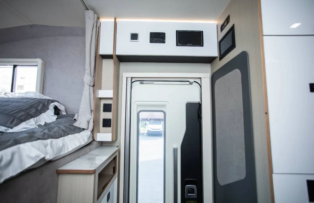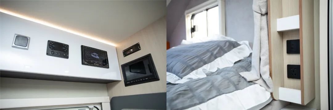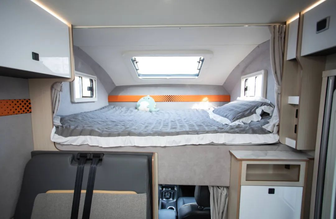 固定休息区位于驾驶舱上方,双人大床,软包+刺绣设计的内饰,并配有一张长1800mm*宽1410mm*厚60mm的高回弹海绵床垫,床铺内高800mm,睡眠舒适度得到充分保障,两侧中空亚克力推拉窗加强采光、通风效果,长住也不会感到压抑。
