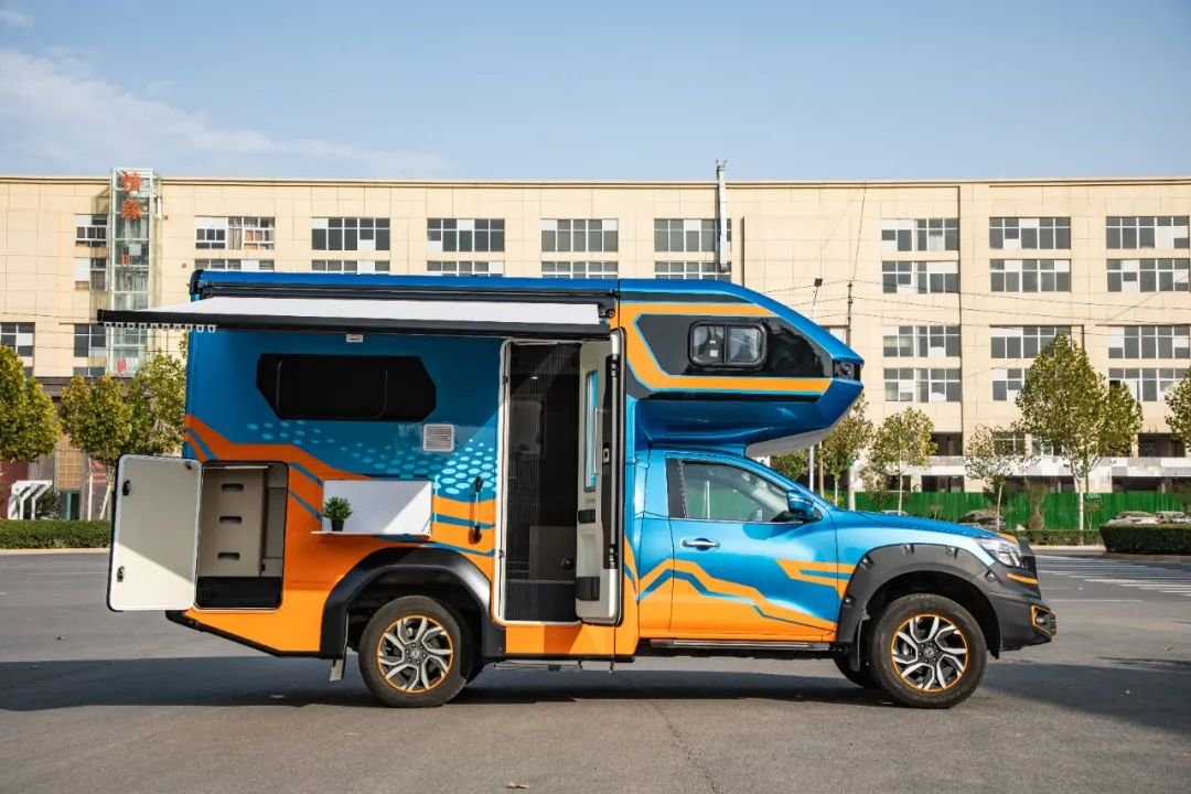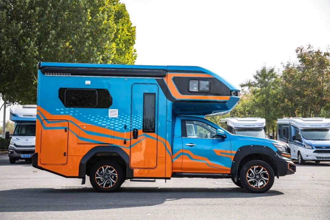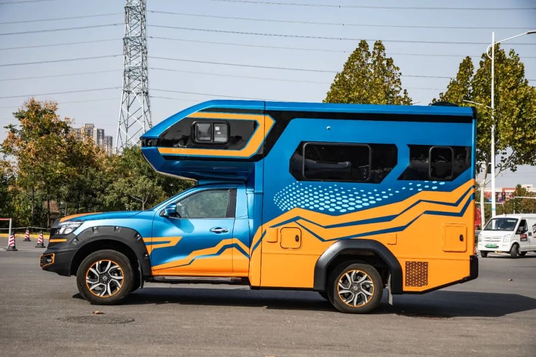 而选配的蓝橙色喷漆,更是让这款车充满运动与活力气息,大幅提升整车颜值;车身外尺寸为5990x2220x2990mm,核载6人,蓝牌C照即可驾驶;不到3米的车高赋予整车较好的通过性能,同时旅居车公告的加持,也让这款车没有常规皮卡车15年强制报废的标准。
