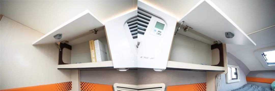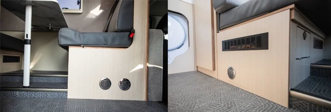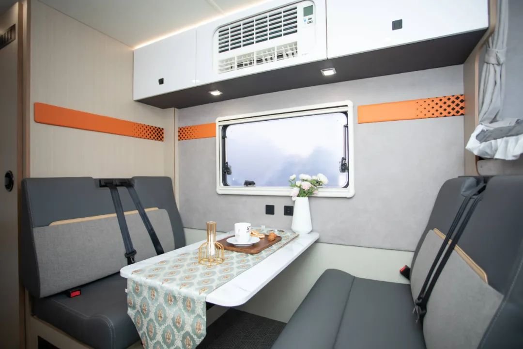 双人对卡座位于生活区左侧位置,配有四条安全带,加上驾驶舱主副驾座椅,整车最多可满足6人出行所需;座椅选用一体环保成型棉,具有低气味、高回弹、长坐无塌陷等优点,搭配符合人体脊柱曲线设计的座椅靠背,可为乘客提供极为舒适的乘坐体验;上方直流变频底置分体式空调可有效减少运行时的噪音并减少功率损耗,相较常见顶置空调来说,更贴近家用空调的使用体验。