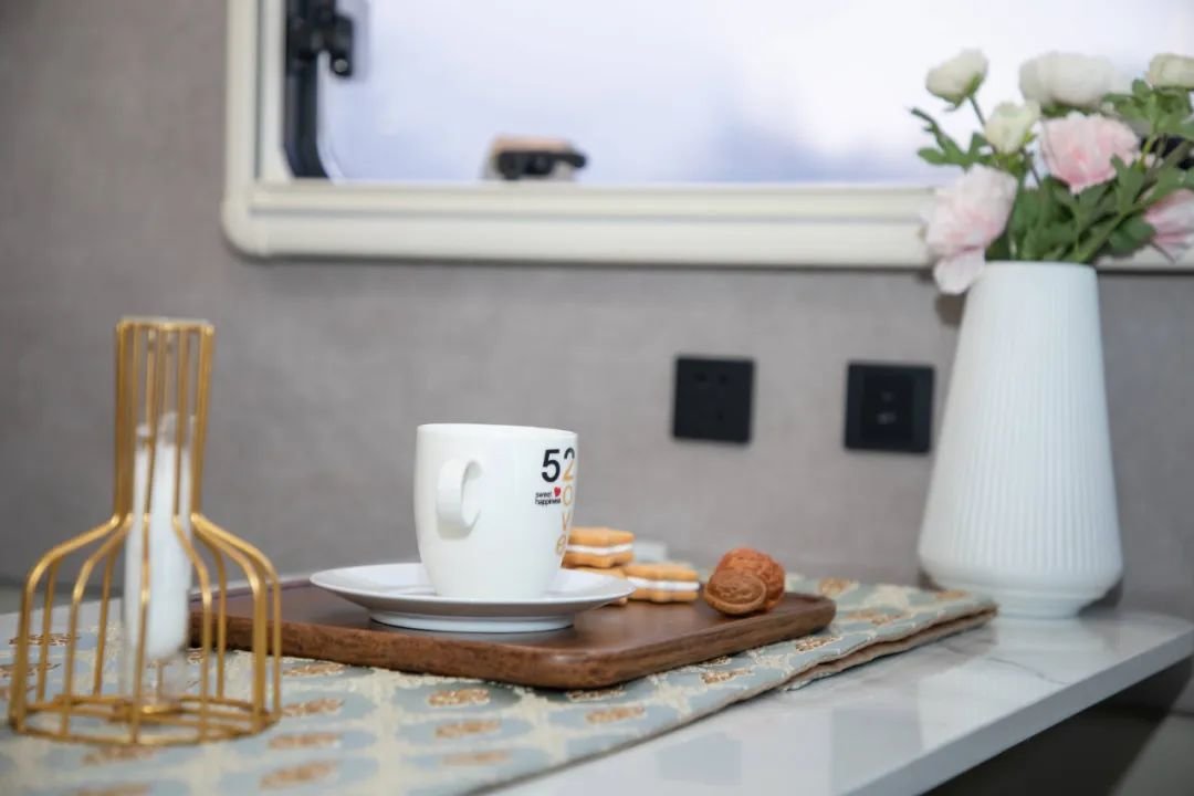 外部设施上,车身右侧作为户外生活使用较多的部分,配备了2.8m宇通定制遮阳棚+晾衣钩、带灯上车扶手、轻量化乘客门、电动伸缩踏步、外置置物板、便携式炉灶+5kg液化气罐固定装置+液化气报警器、车外取水口、车外取电口等,基本满足户外生活场景所需。