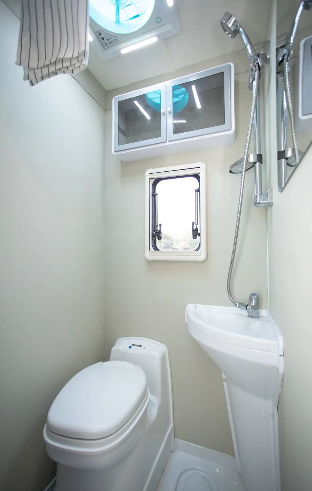 一体式独立卫浴间内部空间有着不错的表现,并配有淋浴花洒、毛巾杆、浴镜、手纸盒、浴帘、洗手盆、吊柜、晾衣杆、暖风出风口、扶手、双向换气扇、集便式马桶等设施,满足旅居生活卫生、盥洗所需。